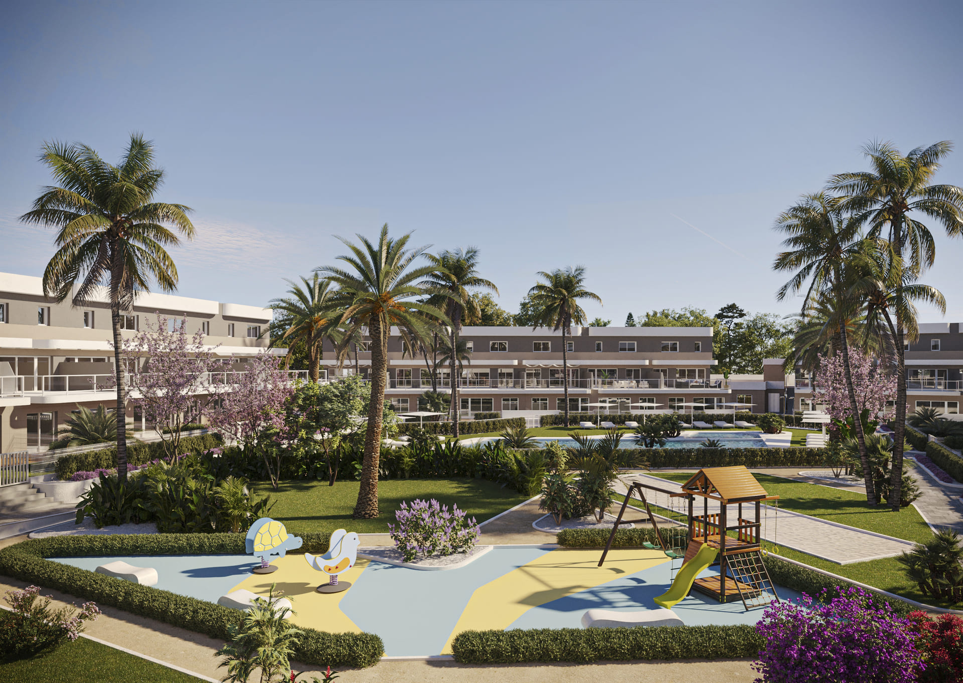 Los exteriores de las viviendas en Monforte del Cid están diseñados para ofrecer un espacio de relajación y disfrute al aire libre. Cada propiedad cuenta con un jardín privado, ideal para quienes desean un contacto directo con la naturaleza desde la comodidad de su hogar. Las terrazas, presentes en todas las viviendas, proporcionan un espacio adicional para disfrutar del clima mediterráneo, perfecto para cenas al aire libre o momentos de descanso. La comunidad también ofrece un solárium comunitario, un espacio donde los residentes pueden relajarse y disfrutar del sol en un ambiente tranquilo y seguro. La cercanía al campo de golf añade un valor adicional a los exteriores, ofreciendo vistas verdes y un entorno sereno.