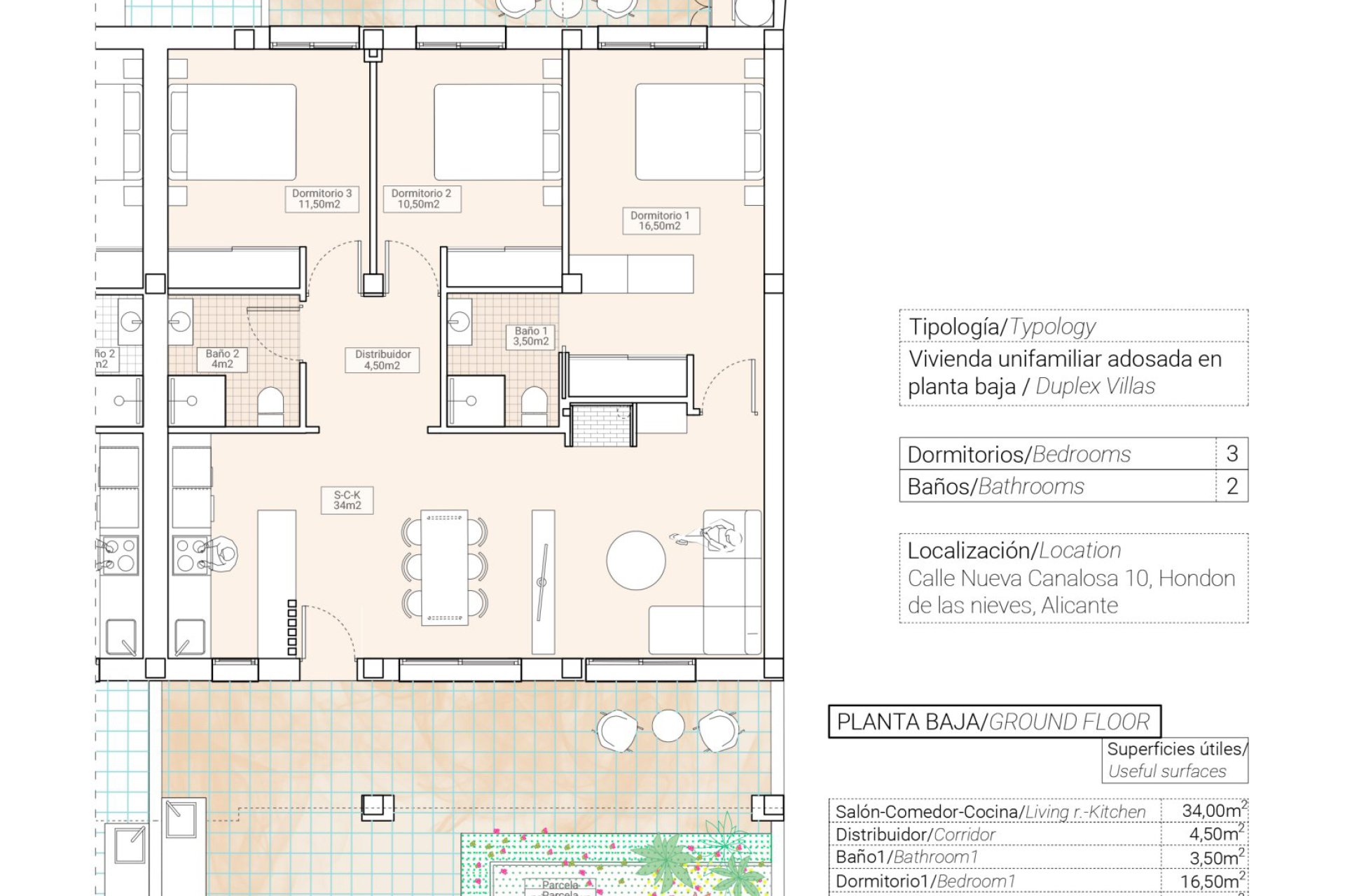 El interior ha sido cuidadosamente planeado para proporcionar confort y funcionalidad máxima. Con tres dormitorios amplios y dos baños completos, cada bungalow está equipado para satisfacer las demandas de una familia moderna. Los suelos cerámicos aportan elegancia mientras son fáciles de mantener, además, las persianas eléctricas y los electrodomésticos incluidos elevan la comodidad diaria. Los armarios empotrados ofrecen espacio generoso para almacenamiento, mientras que la preinstalación del aire acondicionado garantiza confort durante todo el año. El mobiliario completo facilita una mudanza sin estrés hacia tu nuevo hogar.