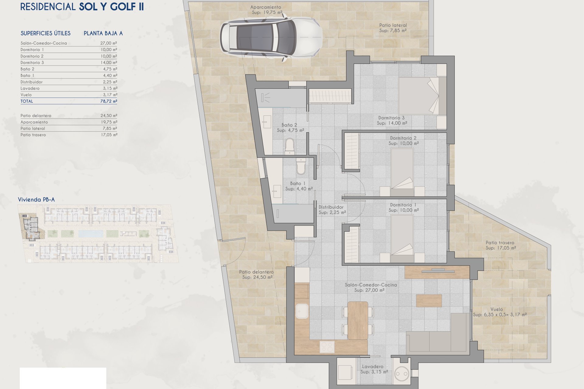 En el pintoresco entorno de Torre-Pacheco, Alicante Spain Properties presenta una oportunidad excepcional para adquirir una vivienda en un complejo residencial compuesto por 24 bungalows. Estas propiedades están disponibles con solárium o jardín, y han sido meticulosamente diseñadas para ofrecer confort y adaptabilidad a diversas necesidades familiares. Su localización es perfecta para los aficionados al golf, situándose a tan solo 0.5 km de un campo de golf reconocido, y con fácil acceso al aeropuerto a 23 km, facilitando así las conexiones nacionales e internacionales.
