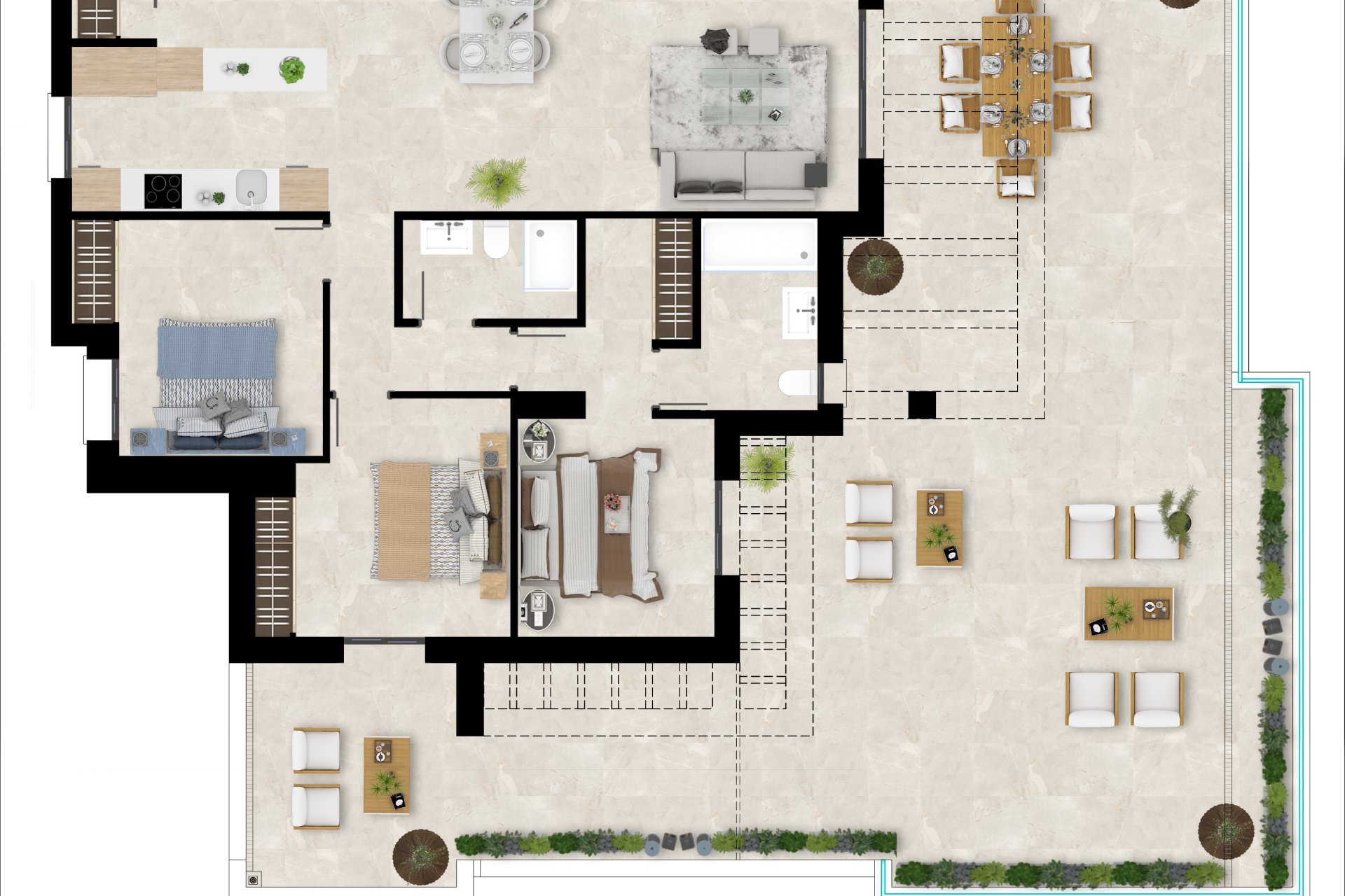 Las viviendas están diseñadas para ofrecer el máximo confort y funcionalidad. Con suelos de gres porcelánico elegantes y fáciles de cuidar, persianas eléctricas y aire acondicionado aseguran comodidad durante todo el año. Las cocinas completamente equipadas facilitan la rutina diaria mientras que los armarios empotrados proporcionan abundante espacio de almacenamiento manteniendo cada habitación ordenada. Disponibles en configuraciones de 2 o 3 dormitorios con 2 baños, estas viviendas se adaptan a diversas necesidades familiares.