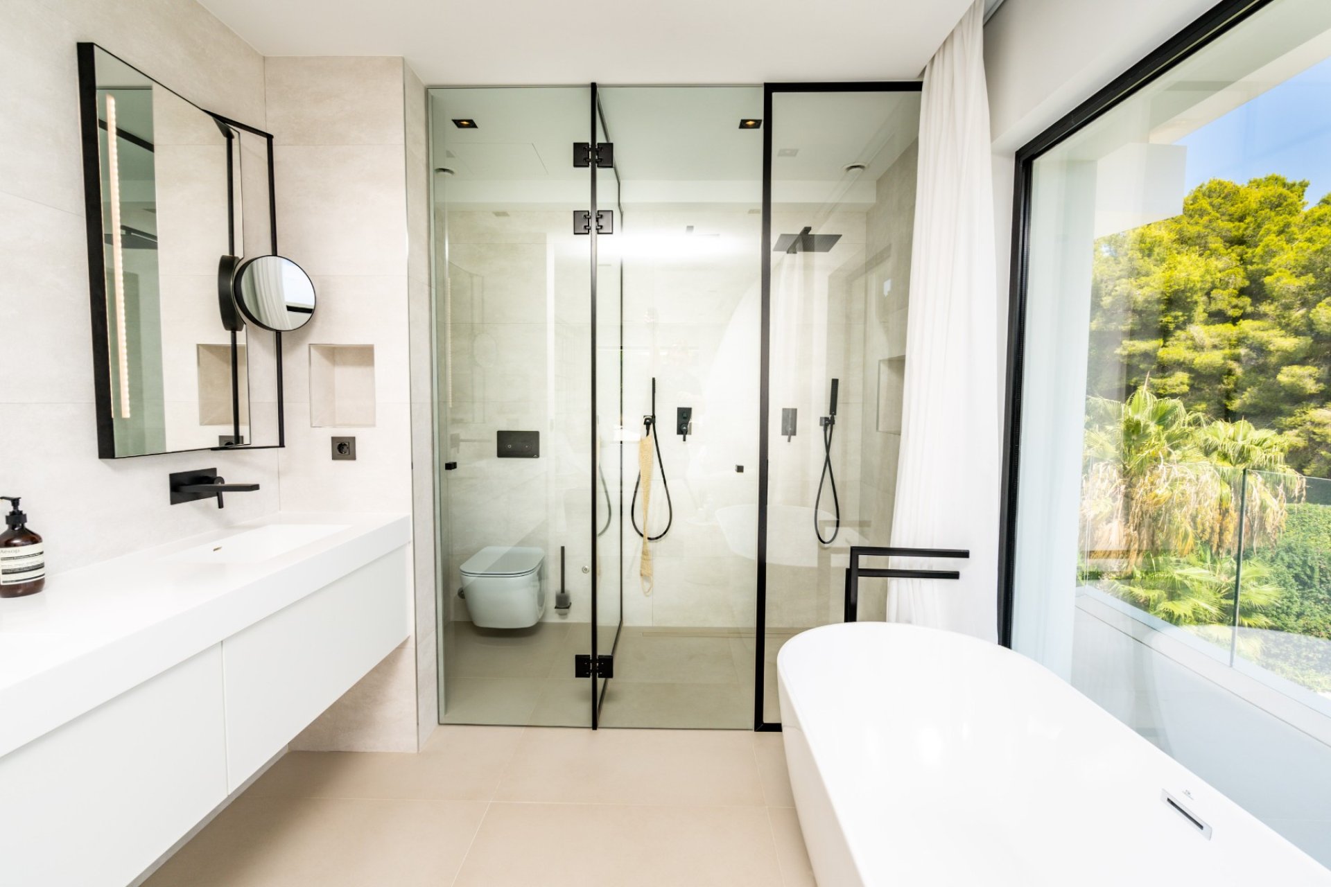 En la planta superior tenemos un exclusivo dormitorio principal con baño en suite y dos dormitorios más con baño en suite. Todos ellos con unas vistas formidables.