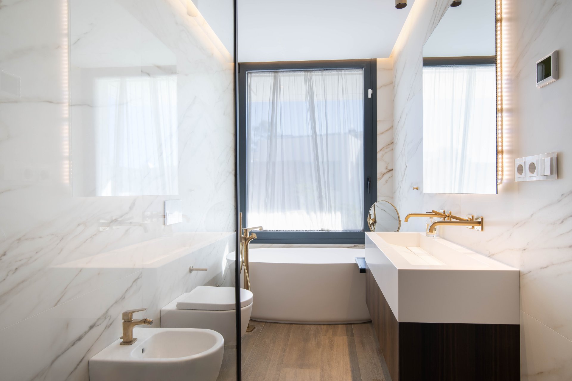 Los interiores son igualmente impresionantes, con una zona de estar de planta abierta, mobiliario elegante y un comedor con vistas espectaculares al exterior. La cocina a medida cuenta con carpintería de madera, una isla de mármol y electrodomésticos de alta gama Gaggenau. La terraza del nivel superior ofrece un espacio chill-out con vistas impresionantes al atardecer.