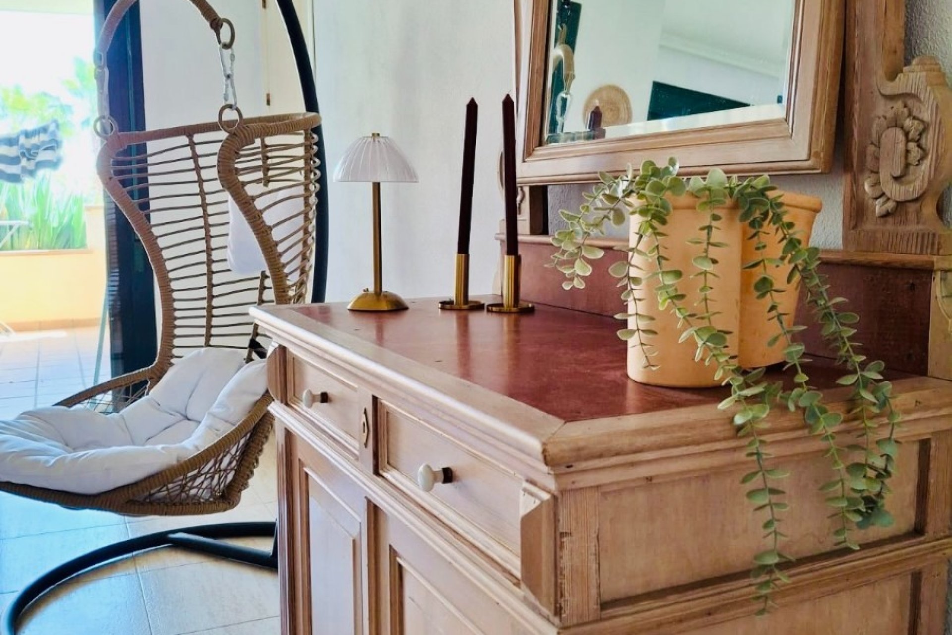 Este impresionante apartamento de 2 habitaciones y 2 baños, ubicado en la planta baja de una urbanización prestigiosa, ofrece la combinación perfecta de lujo y confort. Con su orientación hacia el sur, disfrutarás de abundante luz natural y una atmósfera cálida y acogedora durante todo el año. Entra en el espacioso salón de 45 m², ideal para relajarte o entretener a tus invitados. La cocina separada, completamente equipada, cuenta con una práctica lavandería, manteniendo todo al alcance de la mano. Ambas habitaciones están equipadas con aire acondicionado y tienen baños en suite, asegurando la máxima privacidad y comodidad. Los armarios empotrados ofrecen un amplio espacio de almacenamiento, y la gran terraza soleada de 21 m² ofrece vistas impresionantes de la naturaleza, perfecta para cenar al aire libre o simplemente disfrutar de la tranquilidad. Este apartamento se puede vender completamente amueblado y forma parte de una comunidad bien mantenida con hermosos jardines y una fantástica piscina comunitaria. A solo unos minutos, encontrarás campos de golf de primer nivel como Campoamor, Villamartin, Las Ramblas y Las Colinas. También disfrutarás de la proximidad al centro comercial La Fuente, con varios restaurantes, playas a solo 4 km y el vibrante Zenia Boulevard. - Habitaciones:2 - Baños:2 - Superficie Construida:103 m² - Armarios Empotrados:3 - Año de Construcción:2003 - Orientación:Sur Servicios: - Aire Acondicionado - Piscina Comunitaria - Parque Infantil - Totalmente amueblado, incluyendo 2 cómodos sofás cama (nunca utilizados como camas) - Muebles nuevos (interiores y exteriores) comprados hace 3 años y un colchón nuevo en la habitación principal - Cocina completamente equipada con electrodomésticos modernos - Interfono - Lavandería - Puerta Reforzada - Sistema de Alarma y Cámaras - Seguridad 24/7 Ubicado a solo 600 m de Mercadona, 800 m de Aldi y 740 m del bullicioso centro comercial La Fuente, lleno de bares y restaurantes. ¡No pierdas la oportunidad de tener tu hogar ideal en el soleado Campoamor!