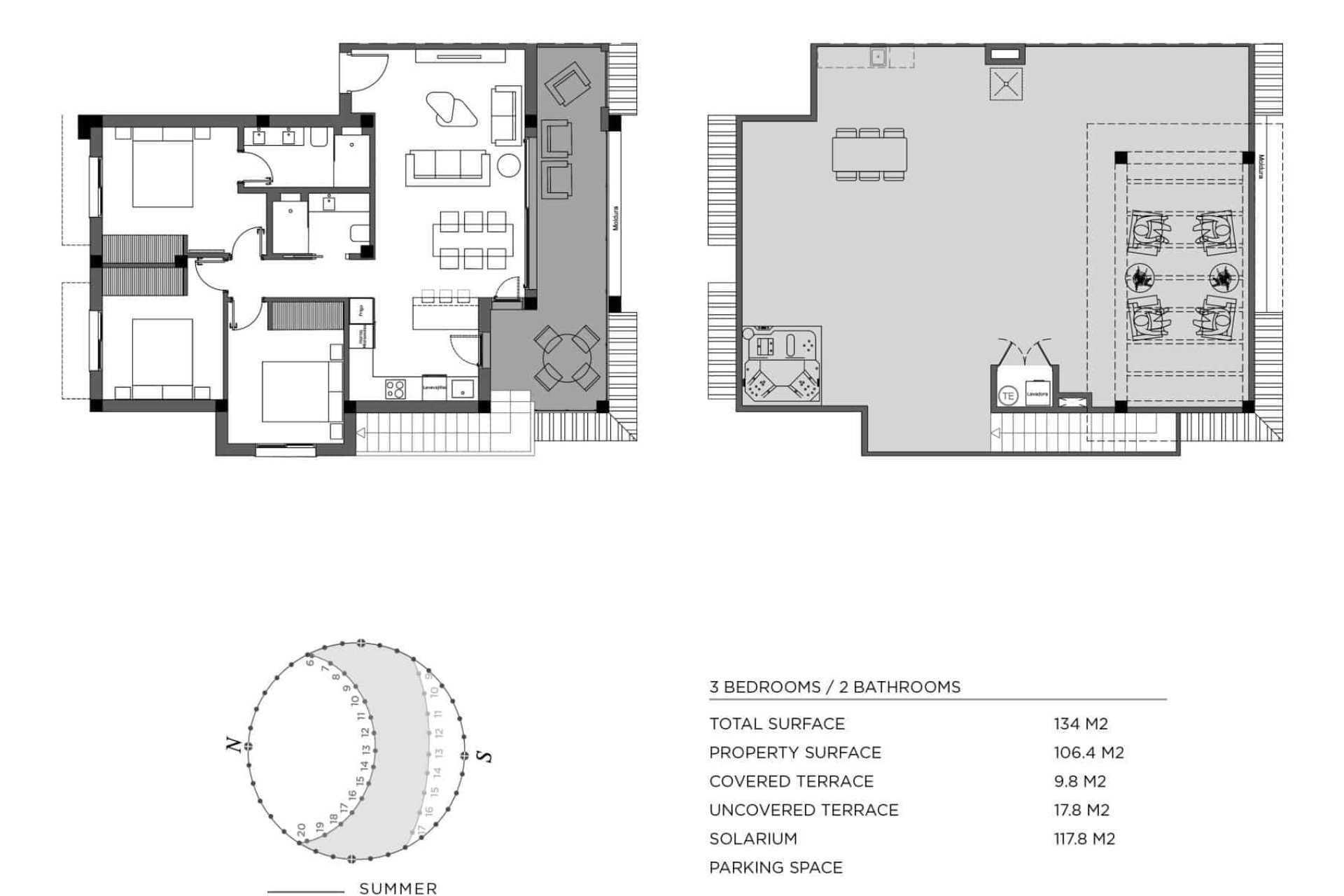 Los exteriores de estas propiedades están diseñados para ofrecer un espacio de vida al aire libre que complementa el interior de las viviendas. Cada propiedad cuenta con un jardín privado, perfecto para disfrutar del clima mediterráneo. Además, las terrazas proporcionan un espacio adicional para relajarse o entretener a los invitados. La inclusión de un solárium en las viviendas permite disfrutar de vistas panorámicas y aprovechar al máximo el sol durante todo el año. La pérgola es un elemento adicional que proporciona sombra y estilo, creando un ambiente acogedor para disfrutar al aire libre.