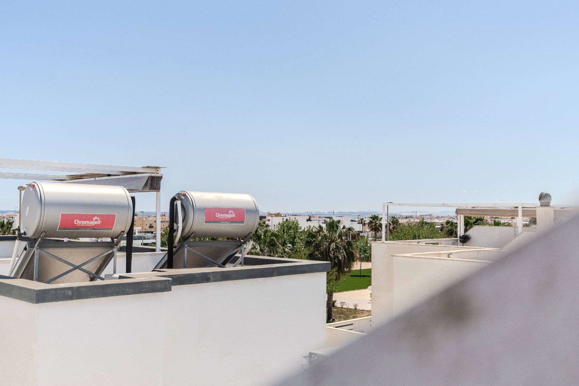 Estamos orgullosos de presentar este precioso ático de 2 dormitorios con una amplia azotea privada, ubicado a tan solo 600 metros de la playa en la tranquila y encantadora Torre de la Horadada. La vivienda destaca por su luminosidad y diseño funcional. Al entrar, el salón y la cocina se presentan como un espacio integrado y acogedor, perfectamente distribuido para aprovechar al máximo la luz natural. La cocina está equipada con todo lo necesario, pensada para ofrecer comodidad y estilo. Desde el salón se accede a la espectacular azotea privada, un espacio perfecto para relajarse, disfrutar del clima mediterráneo o compartir momentos al aire libre con amigos y familia. El ático cuenta con dos amplios dormitorios, ambos con armarios empotrados de puertas correderas que optimizan el espacio, ofreciendo almacenamiento práctico sin comprometer el diseño. El baño, completamente amueblado, presenta acabados modernos y funcionales, ideales para el día a día. La propiedad dispone de aire acondicionado frío/calor, asegurando el máximo confort en cualquier estación del año. Se vende completamente amueblada, lista para entrar a vivir, lo que la convierte en una opción perfecta tanto para vivienda permanente como para casa de vacaciones. En las zonas comunes, podrás disfrutar de una gran piscina rodeada de áreas verdes donde relajarte bajo el sol, así como una pista de pádel para los más activos. Todo está diseñado para crear un entorno tranquilo y agradable, ideal para toda la familia. La ubicación de este ático es inmejorable. Torre de la Horadada ofrece un ambiente relajado con una amplia oferta de servicios como farmacias, supermercados, parques y áreas infantiles. Además, cuenta con un puerto deportivo con restaurantes, bares de tapas y cafeterías que dan vida a la zona durante todo el año. Sus playas de bandera azul, de arena fina y aguas cristalinas, están a pocos pasos de distancia, ofreciendo un entorno privilegiado para disfrutar del mar. A pocos minutos en coche se encuentran reconocidos campos de golf como Lo Romero, Roda Golf y La Serena, así como centros comerciales como "Dos Mares" y "La Zenia Boulevard", donde encontrarás una amplia oferta de tiendas y restaurantes. La conexión con ciudades cercanas como Torrevieja, Alicante y Murcia es excelente, con autobuses frecuentes y acceso rápido por carretera.