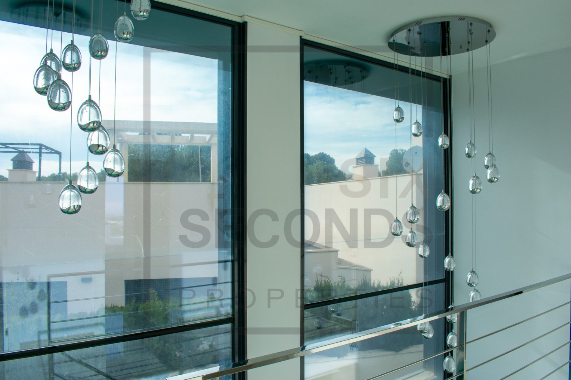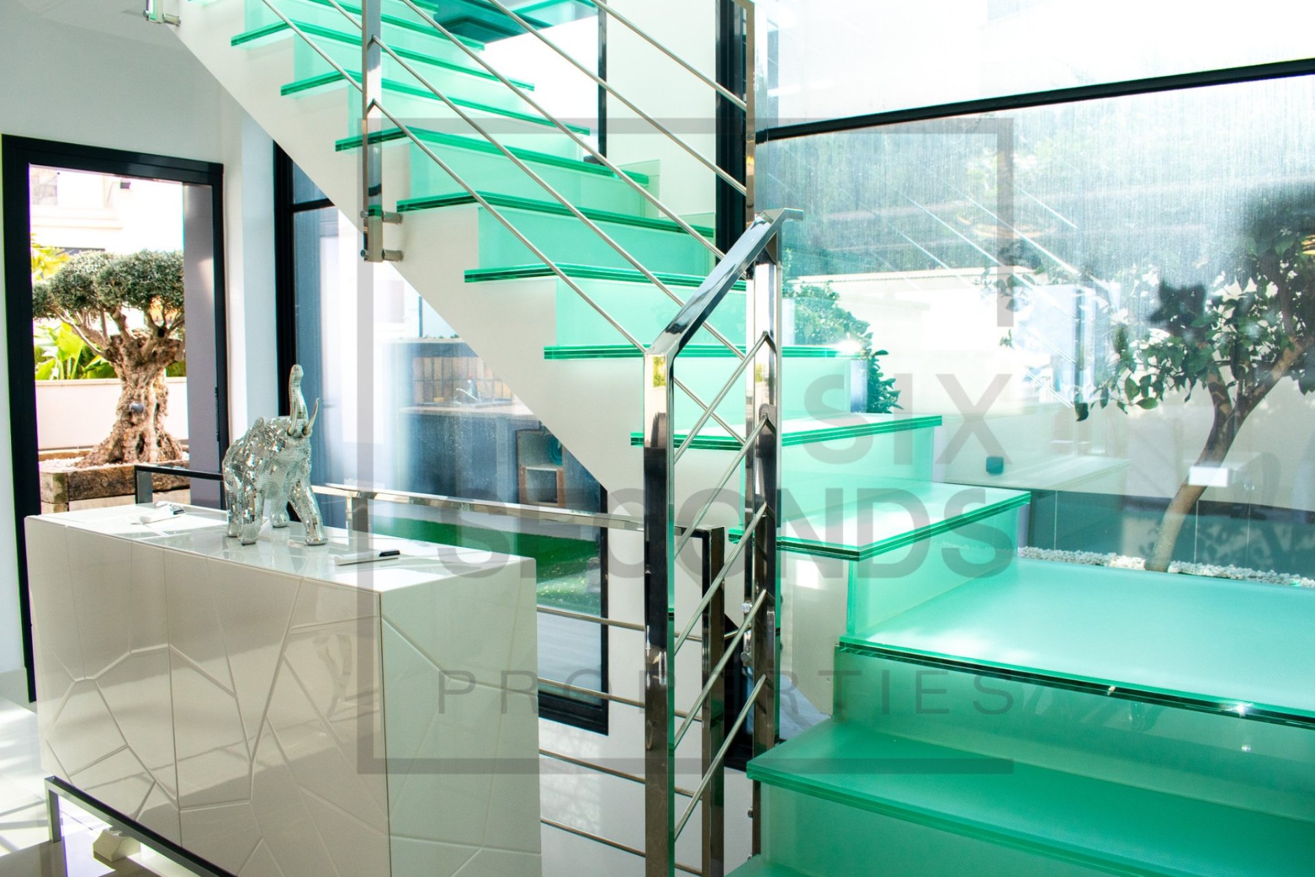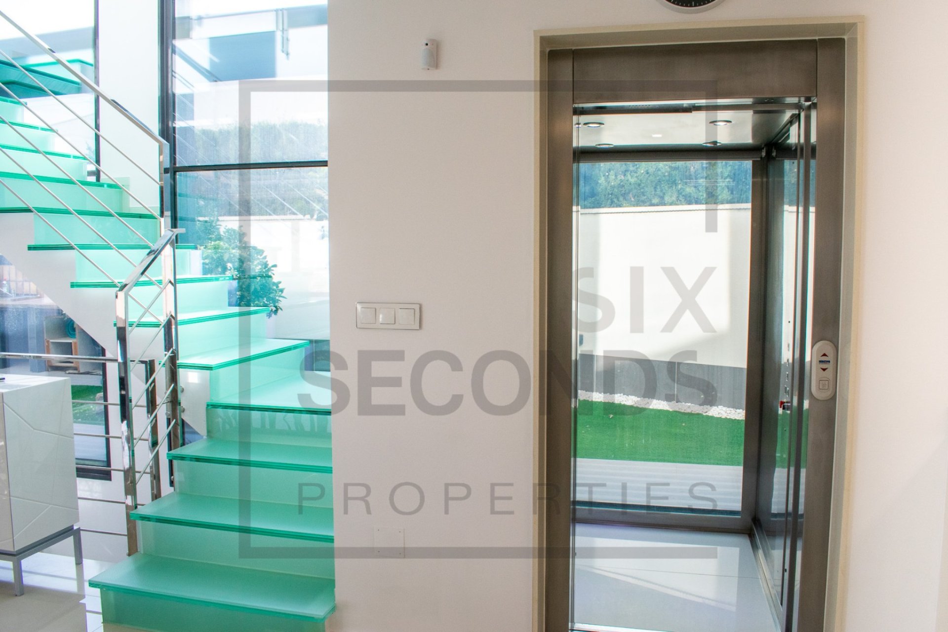Con una distribución impecable en dos plantas y un sótano, esta residencia de 5 dormitorios y 4 baños se erige como un santuario de comodidad y sofisticación. Desde el instante en que se atraviesa el umbral, un ascensor privado nos transporta sin esfuerzo a cada nivel, mientras una impresionante escalera de cristal iluminada nos invita a contemplar la belleza de la arquitectura moderna.