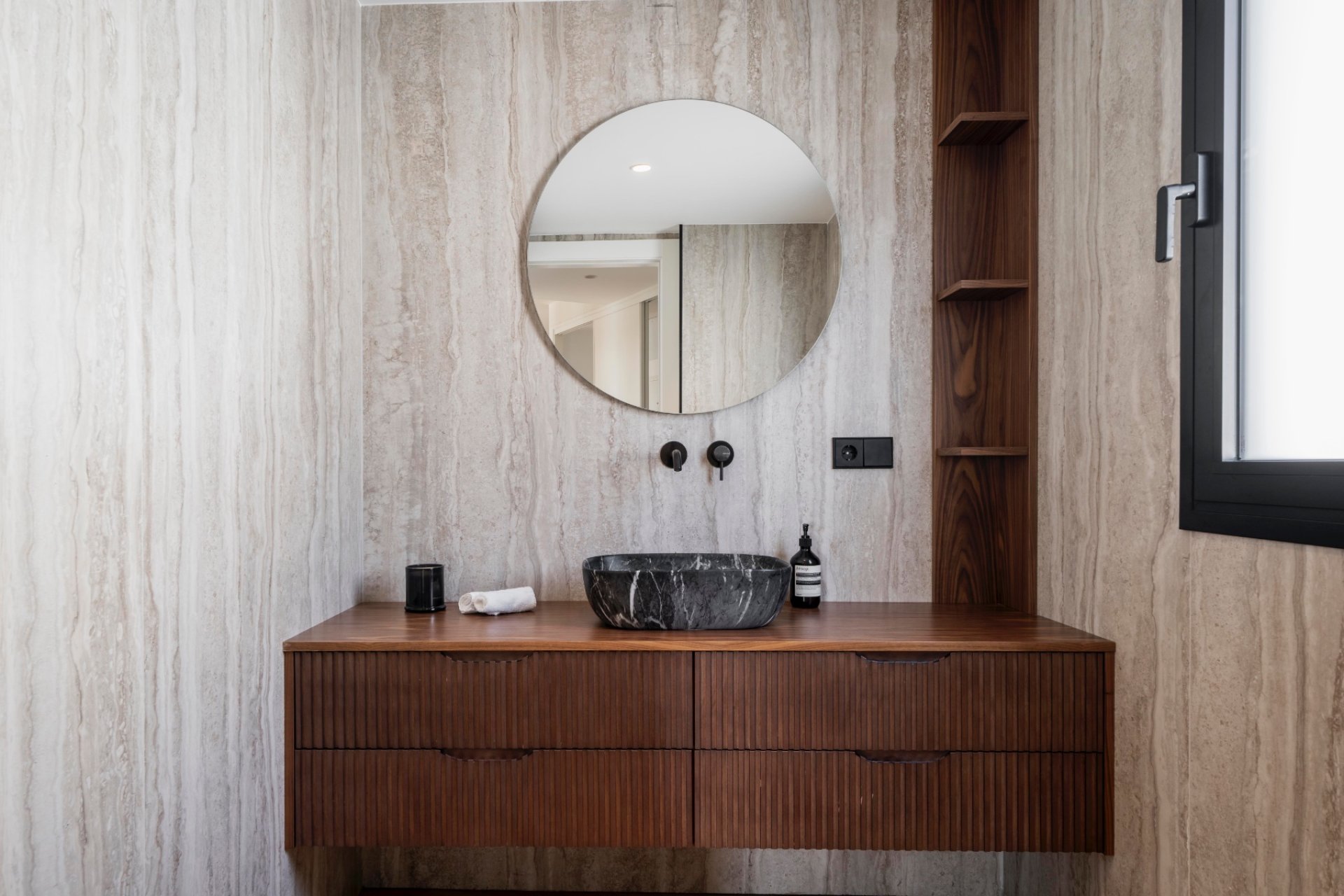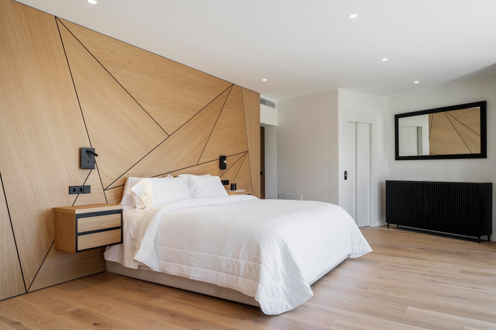 A la izquierda del vestíbulo, un pasillo lleva a tres dormitorios (uno en suite) y un baño completo, todos con vistas al jardín, la piscina y el mar. Una escalera o ascensor conduce al piso superior, dedicado en su totalidad a la suite principal, que incluye dos baños, un vestidor y una terraza privada con vistas al Mediterráneo.