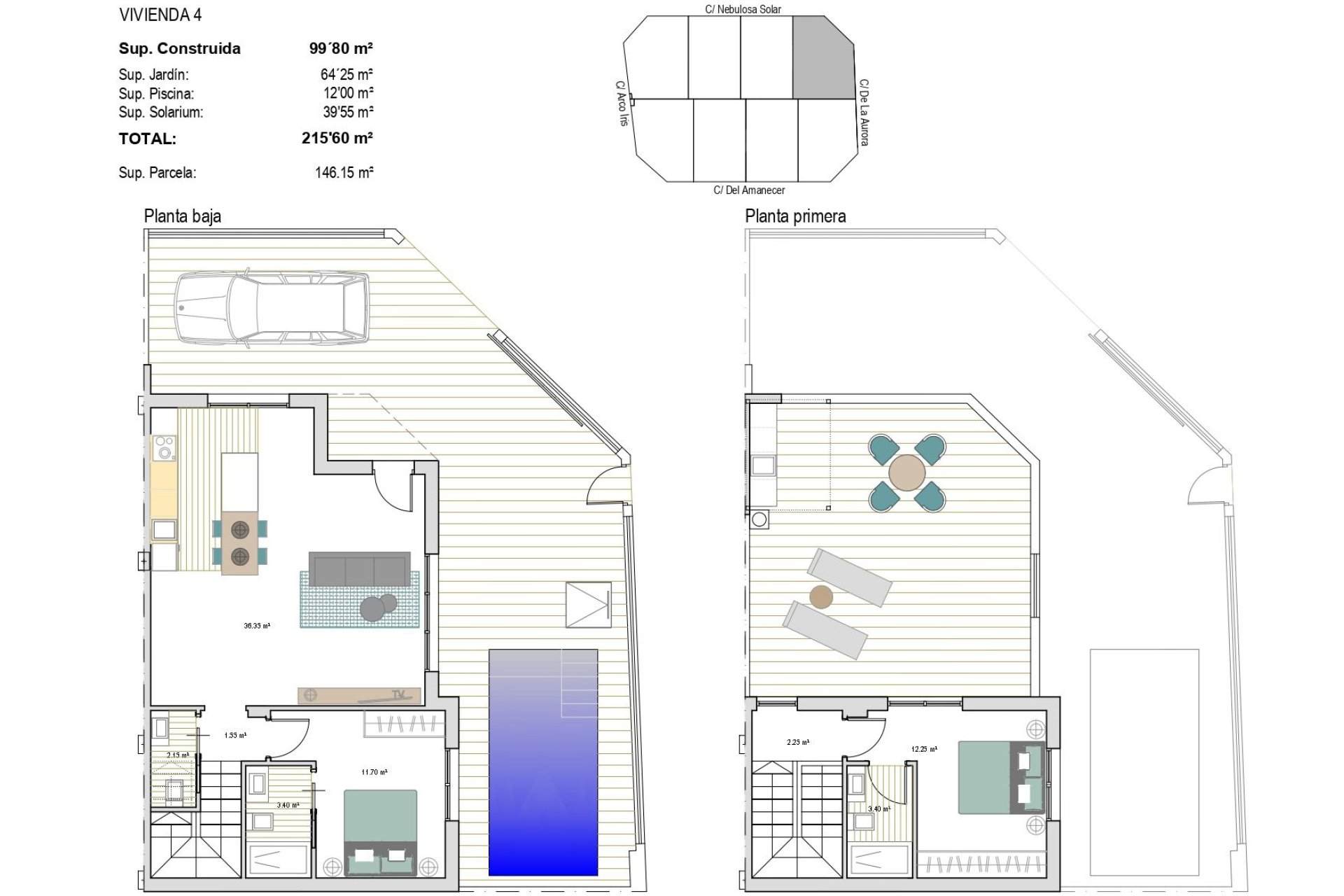 El diseño exterior de los adosados en Roldán incluye un jardín privado, ideal para disfrutar del clima mediterráneo y organizar reuniones al aire libre. Además, cada propiedad cuenta con una terraza que ofrece un espacio adicional para el ocio y el descanso. Para aquellos que disfrutan del sol, el solárium es un lugar perfecto para relajarse y disfrutar de las vistas. La inclusión de una piscina privada en cada adosado añade un toque de lujo y exclusividad, permitiendo a los residentes disfrutar de un refrescante baño en la privacidad de su hogar.