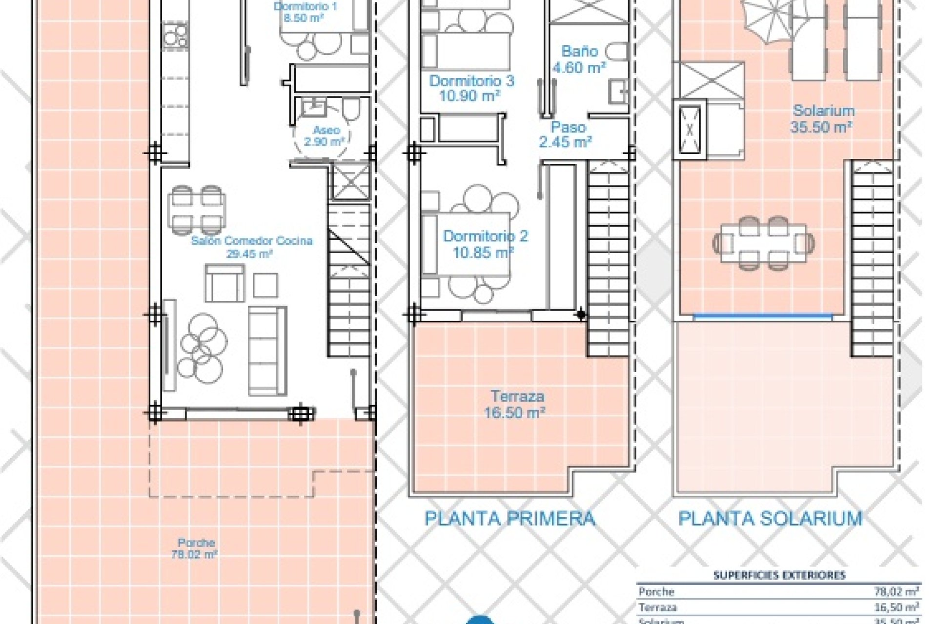 El diseño exterior de estos adosados maximiza las ventajas del clima mediterráneo. Cada unidad cuenta con su propio jardín privado, ideal para disfrutar del aire libre y relajarse. Además, las terrazas y soláriums ofrecen espacios adicionales donde se puede aprovechar al máximo el sol y las vistas espectaculares. La proximidad al mar, a apenas 2 km, permite disfrutar de agradables paseos costeros siempre que se desee.
