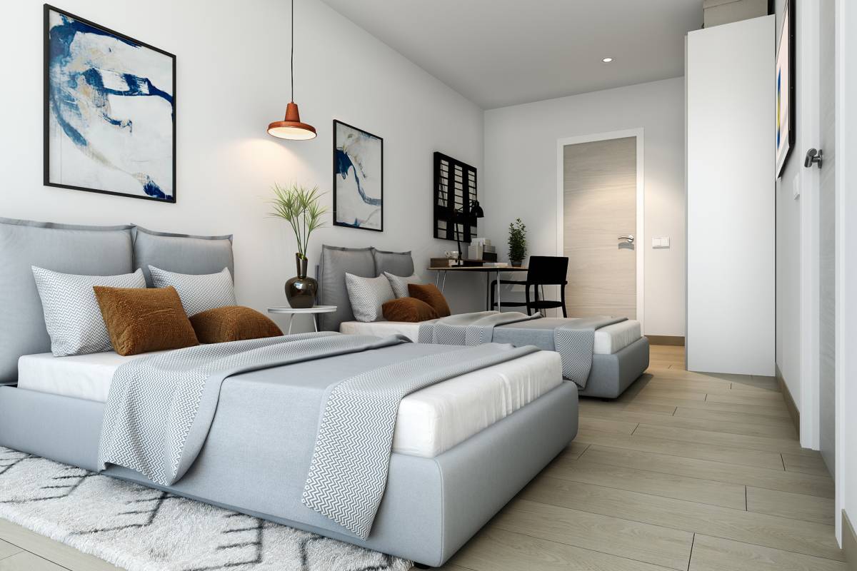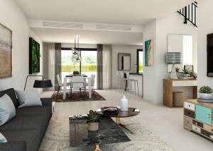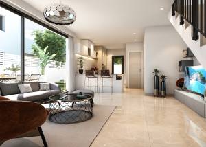 Het interieur van deze woningen is ontworpen met een focus op kwaliteit en comfort. De keramische vloeren, porseleinen tegels en laminaatvloeren geven elke ruimte een moderne en elegante uitstraling. De woningen zijn uitgerust met airconditioning, wat het hele jaar door een aangename sfeer garandeert. Moderne apparaten maken het dagelijks leven gemakkelijker, terwijl ingebouwde kasten efficiënte opslagoplossingen bieden. Technologie speelt ook een belangrijke rol, met video-intercoms en elektrische rolluiken die comfort en veiligheid toevoegen. Bovendien heeft elke woning een oplaadpunt voor elektrische auto's, wat een toewijding aan duurzaamheid en innovatie weerspiegelt.