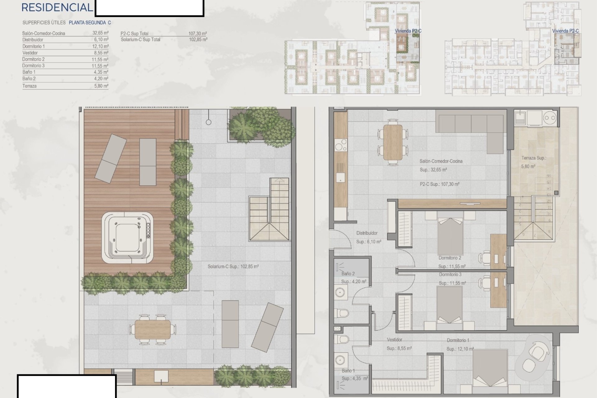 Het interieur is ontworpen om een gezellige en praktische ruimte te bieden. Zowel de appartementen als de penthouses zijn uitgerust met moderne apparaten die dagelijkse taken vergemakkelijken. De keramische vloeren voegen niet alleen elegantie toe, maar zijn ook gemakkelijk schoon te maken. De inbouwkasten bieden efficiënte opbergoplossingen terwijl de esthetiek intact blijft. Sommige woningen hebben een jacuzzi om luxe en ontspanning aan het dagelijks leven toe te voegen. De indelingen variëren tussen 2 of 3 slaapkamers met 2 badkamers, wat voldoet aan verschillende gezinsvoorkeuren.