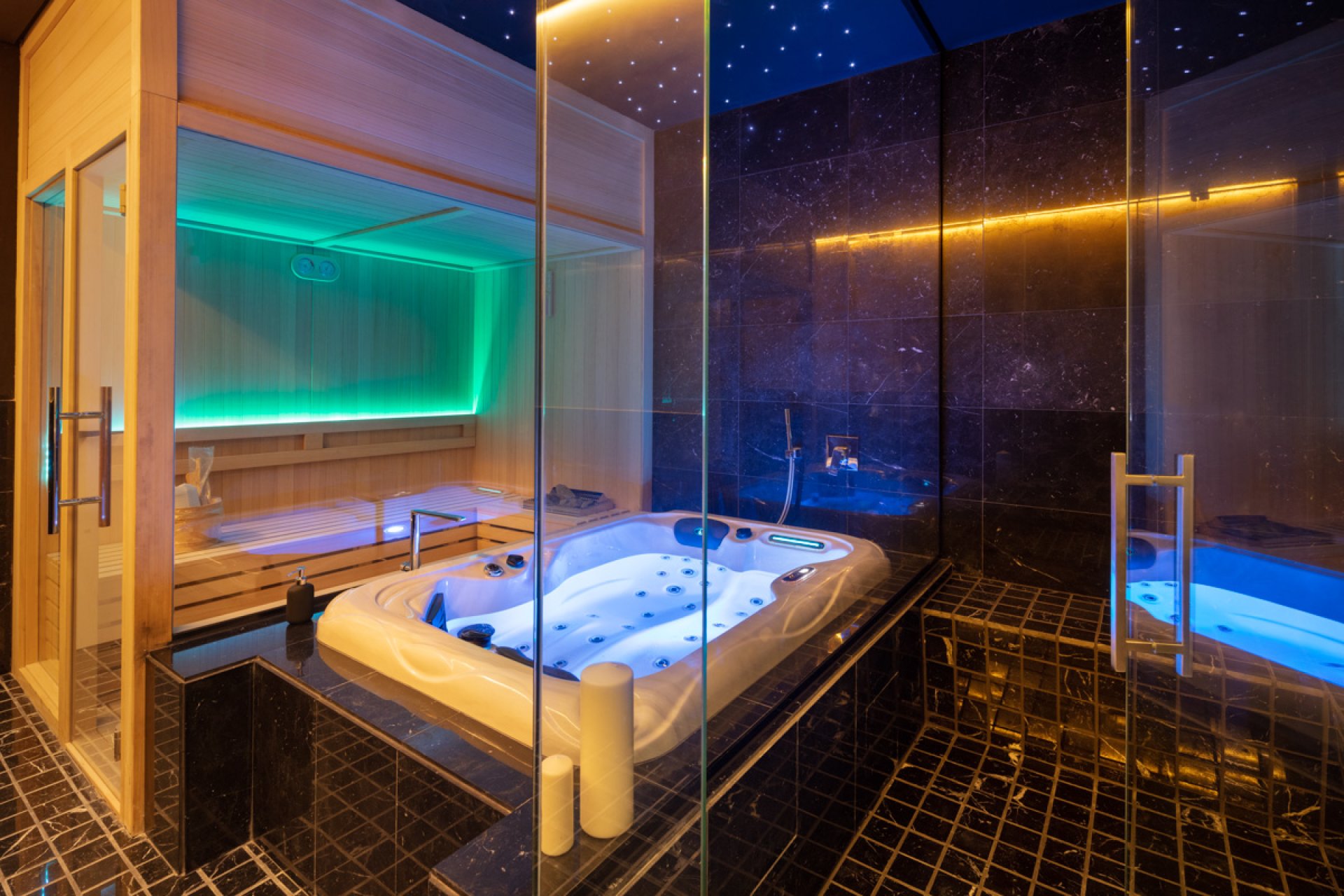 Binnen valt de villa op door zijn ontwerp dat gericht is op luxe en comfort. Marmeren vloeren voegen verfijning toe aan elke hoek, terwijl geavanceerde systemen zoals airconditioning en vloerverwarming zorgen voor comfort het hele jaar door. De geavanceerde domotica vergemakkelijkt een efficiënte controle van het huis, aangevuld met hoogwaardige apparaten die dagelijkse taken vereenvoudigen. Inbouwkasten bieden praktische opslag zonder in te boeten op esthetiek. Voor momenten van persoonlijke ontspanning beschikt de villa over een spa met jacuzzi.
