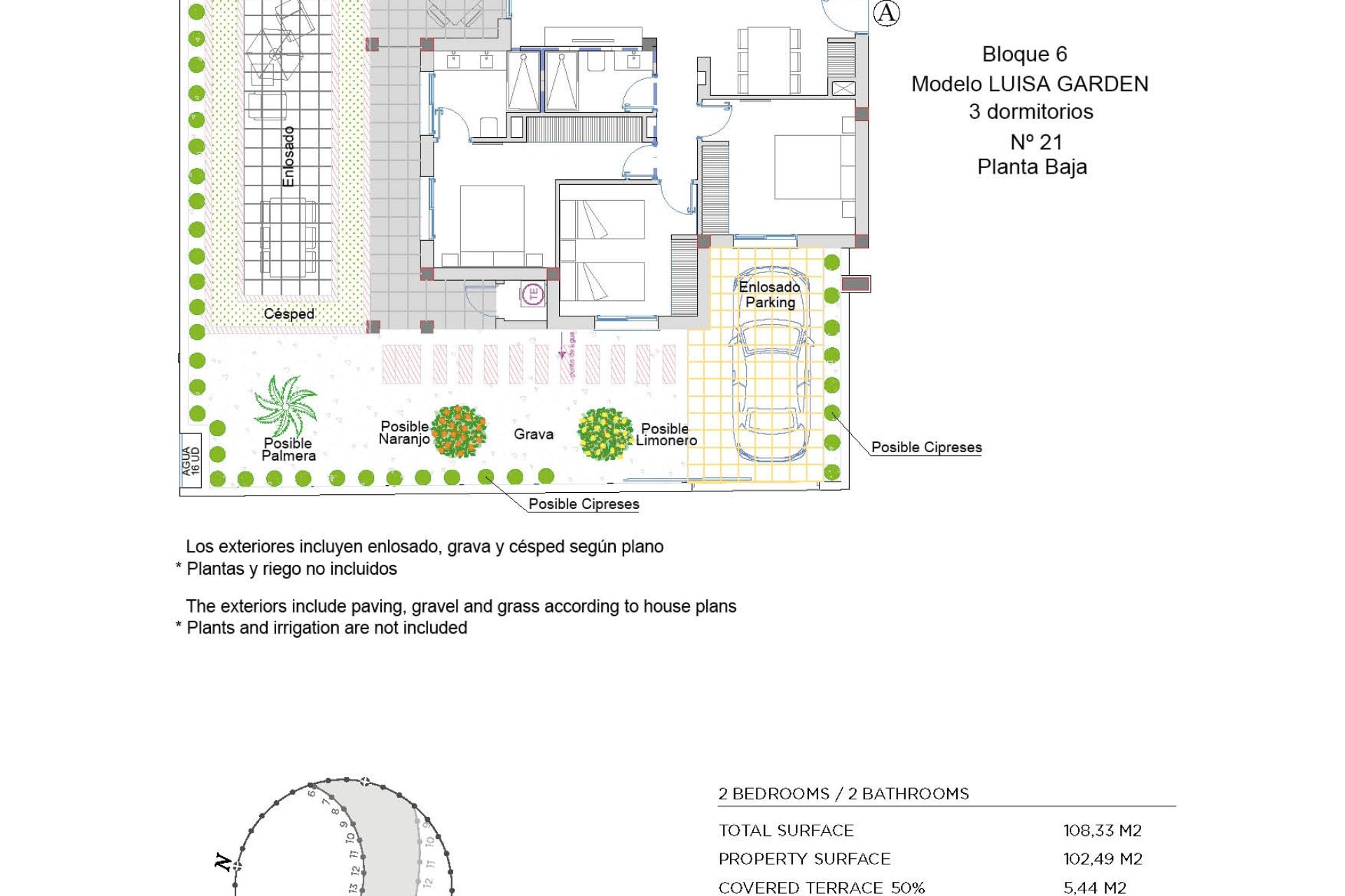 Het interieur van de bungalows is zorgvuldig ontworpen om comfort en stijl te bieden. Met twee slaapkamers en twee badkamers is elke ruimte geoptimaliseerd voor comfort. De vloeren van porseleinen tegels geven een moderne uitstraling en zijn gemakkelijk te onderhouden. Elektrische rolluiken en ingebouwde kasten zijn standaardkenmerken die de functionaliteit van het huis verbeteren. Bovendien zorgt de voorinstallatie van airconditioning ervoor dat het binnenklimaat altijd aangenaam is. De indeling omvat een garage, die een veilige plek voor het voertuig biedt.