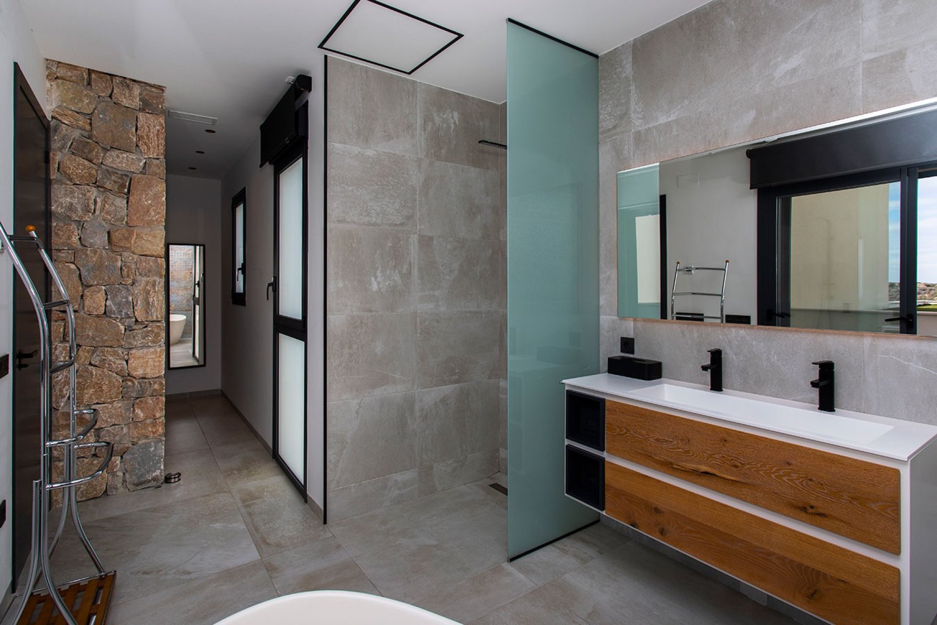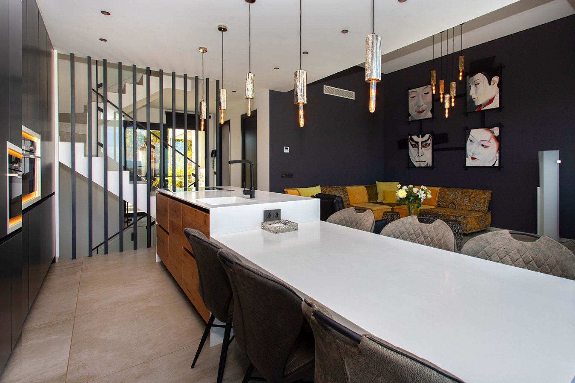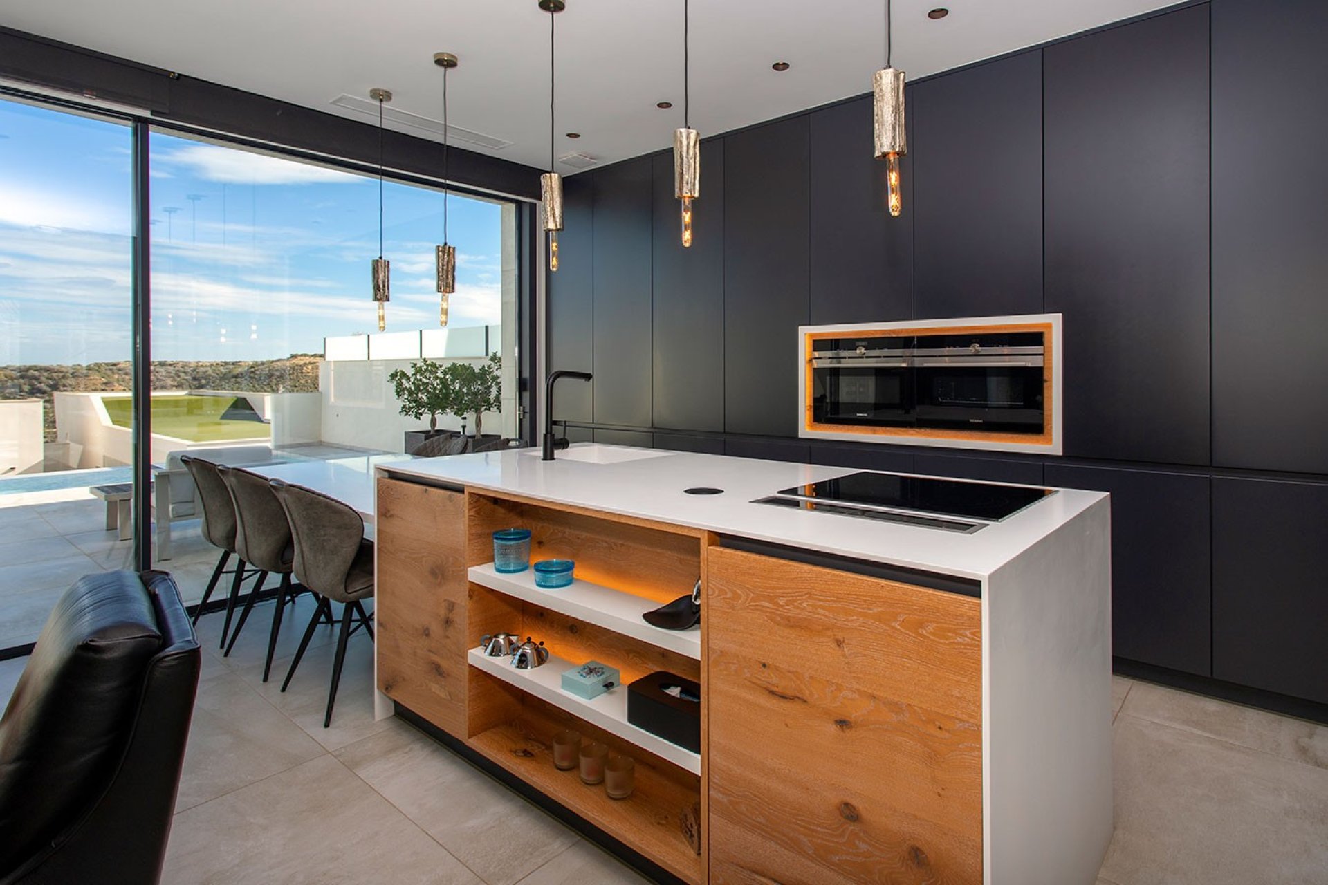 Deze prachtige, recente woning combineert moderne architectuur, hoogwaardige afwerking en een uitzonderlijke ligging met adembenemende vergezichten over de bergen én de zee. Met een royale woonoppervlakte van 252 m² verdeeld over drie verdiepingen biedt deze villa ruimte, licht en comfort in overvloed. De open keuken is een echte eyecatcher: alle toestellen zijn strak geïntegreerd en centraal bevindt zich een stijlvol kookeiland met aangebouwde tafel voor 6 personen, perfect voor diners en lange avonden met familie of vrienden. Grote schuiframen zorgen voor veel natuurlijk licht en een naadloze verbinding met buiten. De woning beschikt over 3 ruime slaapkamers, elk met een ensuite badkamer afgewerkt met hoogwaardige tegels en natuurlijke materialen, plus een gastentoilet. De bergruimte met geïntegreerde wasmachine en droogkast biedt extra gemak en esthetiek doorheen de woning. Buiten wacht een ruim zonnig terras met bioklimatische pergola en een 20 m² infinity zwembad met elektrische afdekking, ideaal om het hele jaar door van de zon te genieten. De polyvalente ruimte met sauna, kantoorhoek en entertainment-/fitnessruimte kan volledig naar eigen wens worden ingericht: wellness, thuisgym, hobby of extra leefruimte. Extra comfort en voordelen: Vloerverwarming op de begane grond en in de badkamers Airconditioning Zonnepanelen Garage (uniek in de regio) De woning is perfect onderhouden en straalt kwaliteit uit. Kwaliteitsmeubelen kunnen optioneel worden overgenomen. Toplocatie: nabij golfterrein Rojales, winkels, restaurants, gezellige barretjes én het beschermde natuurpark El Recorral, een groene oase met wandelpaden, meren en picknickzones. Uitstekende verbindingen naar andere steden en dorpen. Een uitzonderlijke woning voor wie luxe, ruimte, rust en uitzicht zoekt, zonder in te boeten aan comfort of bereikbaarheid. Interesse? Aarzel dan niet en neem vandaag nog contact met ons op!