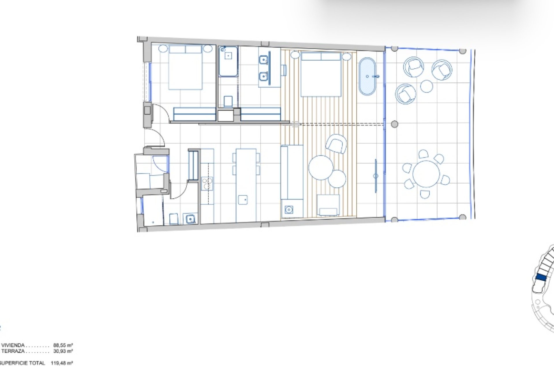 De woningen zijn ontworpen met kwaliteit en dagelijks comfort in gedachten. Met porseleinen tegels stralen de kamers moderniteit en elegantie uit. De keukens zijn uitgerust met premium apparaten die stijl en functionaliteit combineren. Er zijn indelingsopties tussen 2 of 3 slaapkamers, allemaal voorzien van inbouwkasten, vergezeld van 2 complete badkamers die voldoende ruimte garanderen voor diverse gezinnen. Vloerverwarming samen met airconditioning zorgt voor een gezellige omgeving het hele jaar door, terwijl domotica een efficiënte beheersing van de faciliteiten van het huis mogelijk maakt.