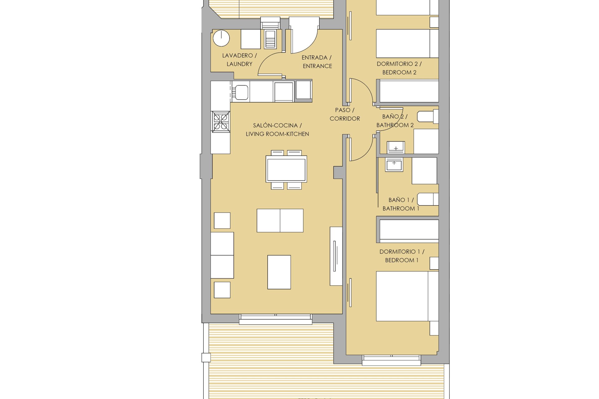 The interiors are meticulously designed with modern comfort and functionality in mind. Available in 2 or 3 bedroom configurations with 2 bathrooms, these spaces ensure comfort regardless of family size. Built-in wardrobes optimize storage while ceramic floors provide a contemporary style that is easy to maintain. Equipped with air conditioning and additional pre-installation, the homes guarantee a pleasant temperature year-round.
