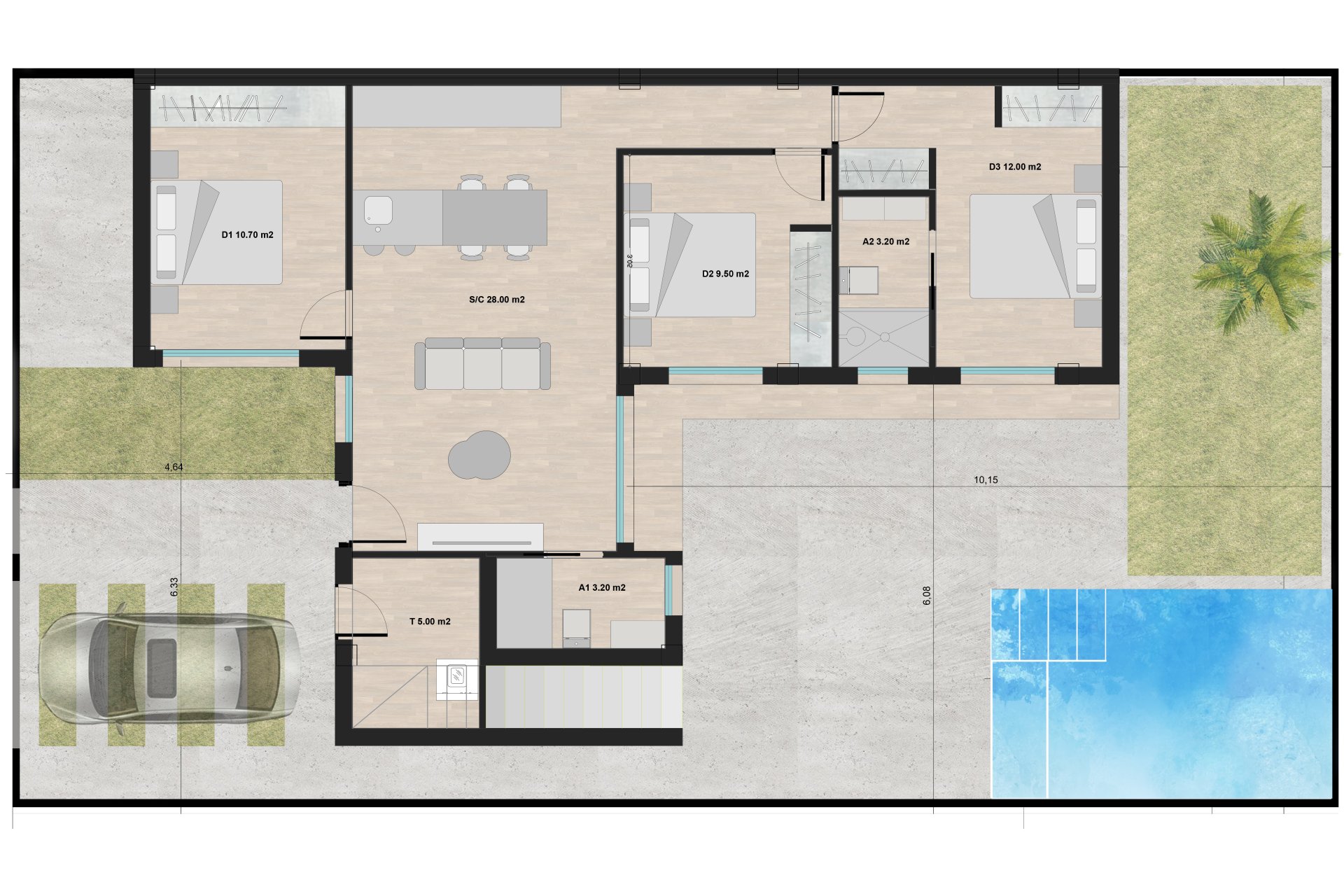 The exterior of each independent home is characterized by its modern and practical style. Enjoy the luxury of a private garden, perfect for outdoor gatherings. Additionally, each house features its own private pool, ideal for hot summer days. The terraces and solariums provide the perfect setting to relax under the Mediterranean sun, while the garage adds convenience and security to parking.