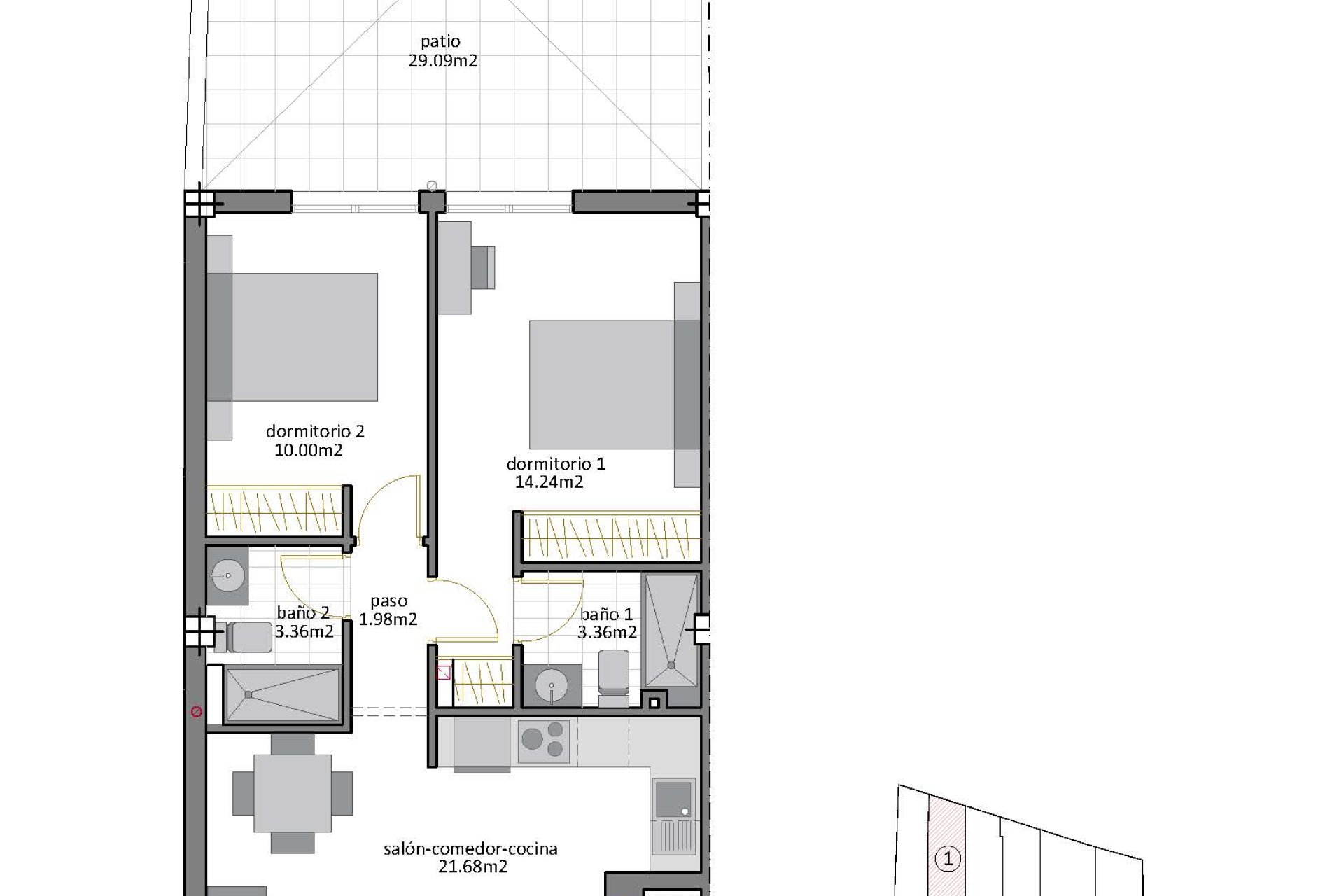Inside, these homes stand out for their elegant and functional design. Equipped with 2 bedrooms and 2 bathrooms, they offer the perfect space for couples or families. The built-in wardrobes optimize storage, and the included appliances make life easier. Additionally, the air conditioning ensures a cozy environment throughout the year.