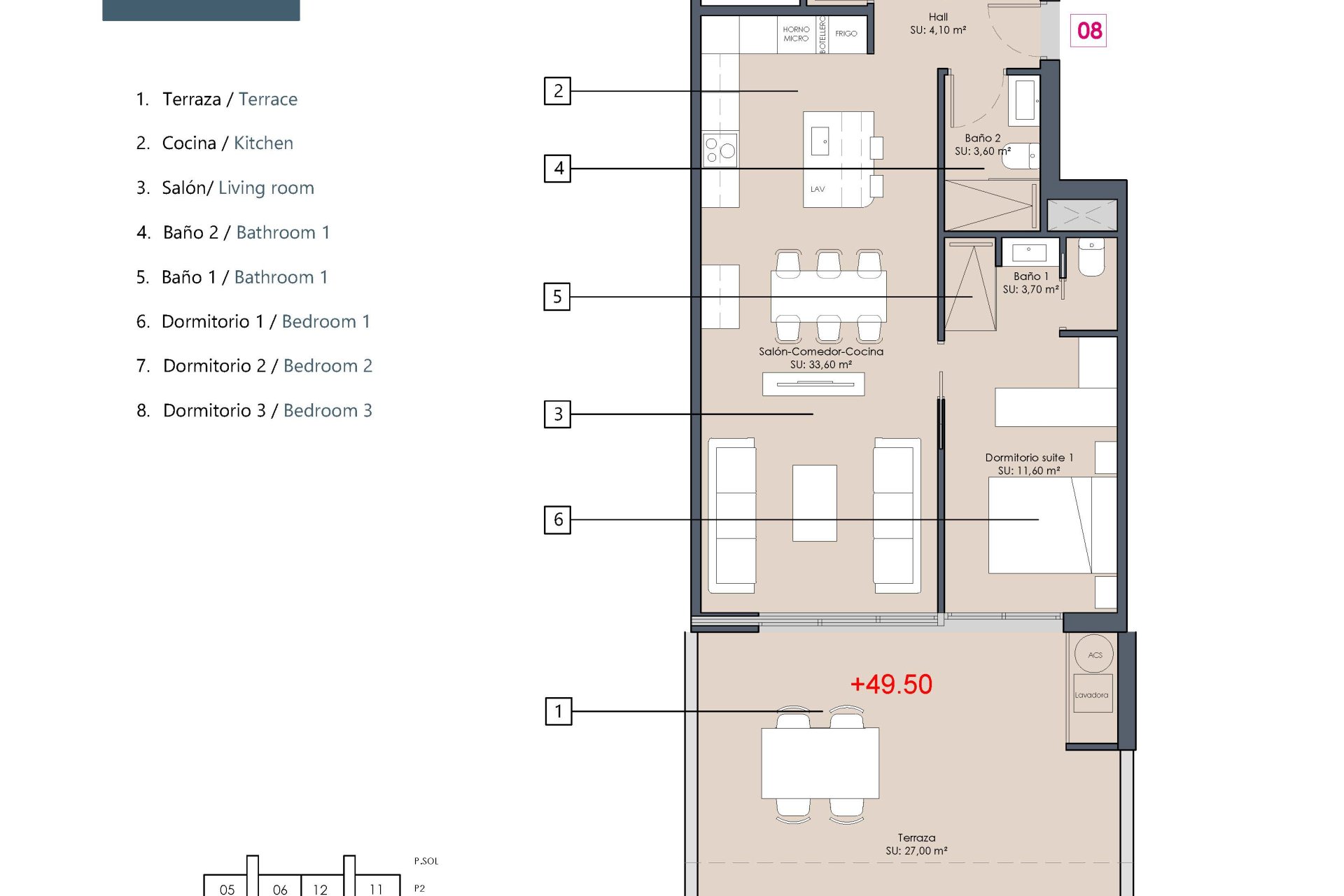 The common facilities of the complex enrich the quality of life for its inhabitants. Gardened areas create a green and serene environment for relaxing walks. The communal pool is perfect for cooling off in the summer, while the common solarium is ideal for sunbathing or socializing with neighbors. Additionally, the playground provides a safe space where children can play freely, fostering new friendships.