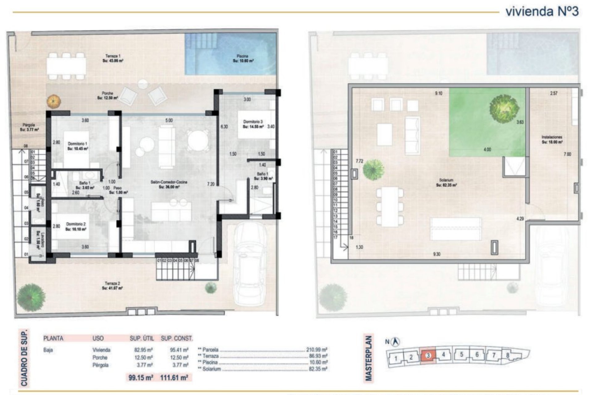 Alicante Spain Properties presents you with an exclusive selection of 6 townhouses located in the picturesque Sucina. These homes combine comfort and functionality in a serene and well-connected environment. Just 0.841 km from the golf course, they are perfect for enthusiasts of this sport. Additionally, the airport is 27 km away, ensuring easy access to international flights. This privileged location offers the opportunity to establish your home in an exceptional place.