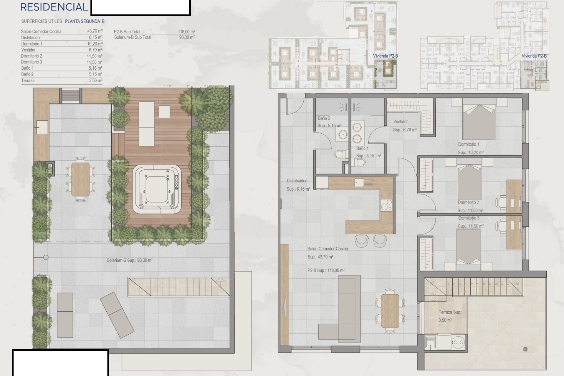 Alicante Spain Properties presents an exclusive residential complex in Torre-Pacheco, consisting of 21 units between apartments and penthouses. This enclave offers the tranquility of a serene environment without sacrificing modern comforts. Located just 25 km from the nearest airport, it ensures excellent connectivity for those who value quick access to air transport. With options of 2 or 3 bedrooms and 2 bathrooms, these homes have been designed with comfort and functionality in mind, adapting to various family needs.