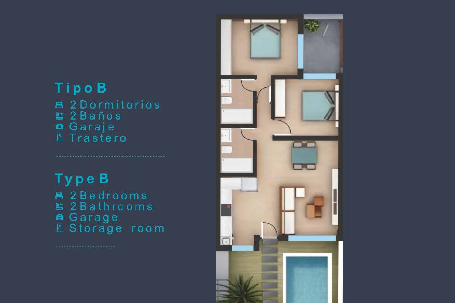In San Pedro del Pinatar, the residential complex of Alicante Spain Properties offers 10 exclusive bungalow-type homes. With options ranging from solarium to garden, these properties are ideal for those seeking comfort and functionality near the sea, just 2 km away. The proximity to the airport, located 43 km away, facilitates frequent travel. The different configurations allow for a choice between 2 or 3 bedroom homes, adapting to various family needs.