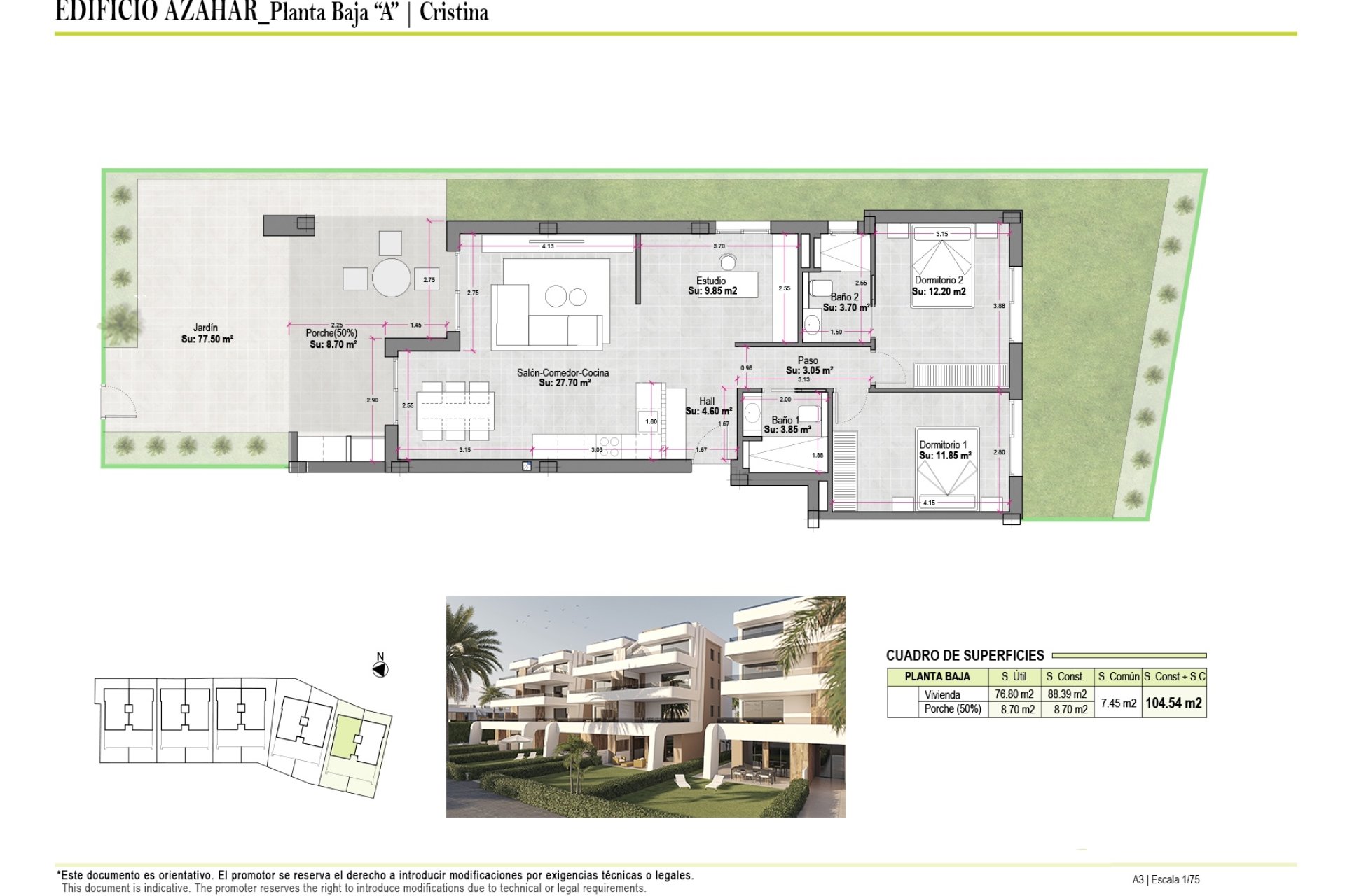 Alicante Spain Properties presents an exclusive residential complex in Los Guardianes, consisting of 14 homes that include apartments, ground floors, bungalows with gardens, and penthouses. Ideal for those seeking modern comfort and functionality, these properties offer top-quality appliances, built-in wardrobes, and pre-installation of air conditioning. Just 41.3 km from the airport, the location combines tranquility with accessibility to services. With options of 2 or 3 bedrooms and 2 bathrooms, each home is designed to meet various family needs.