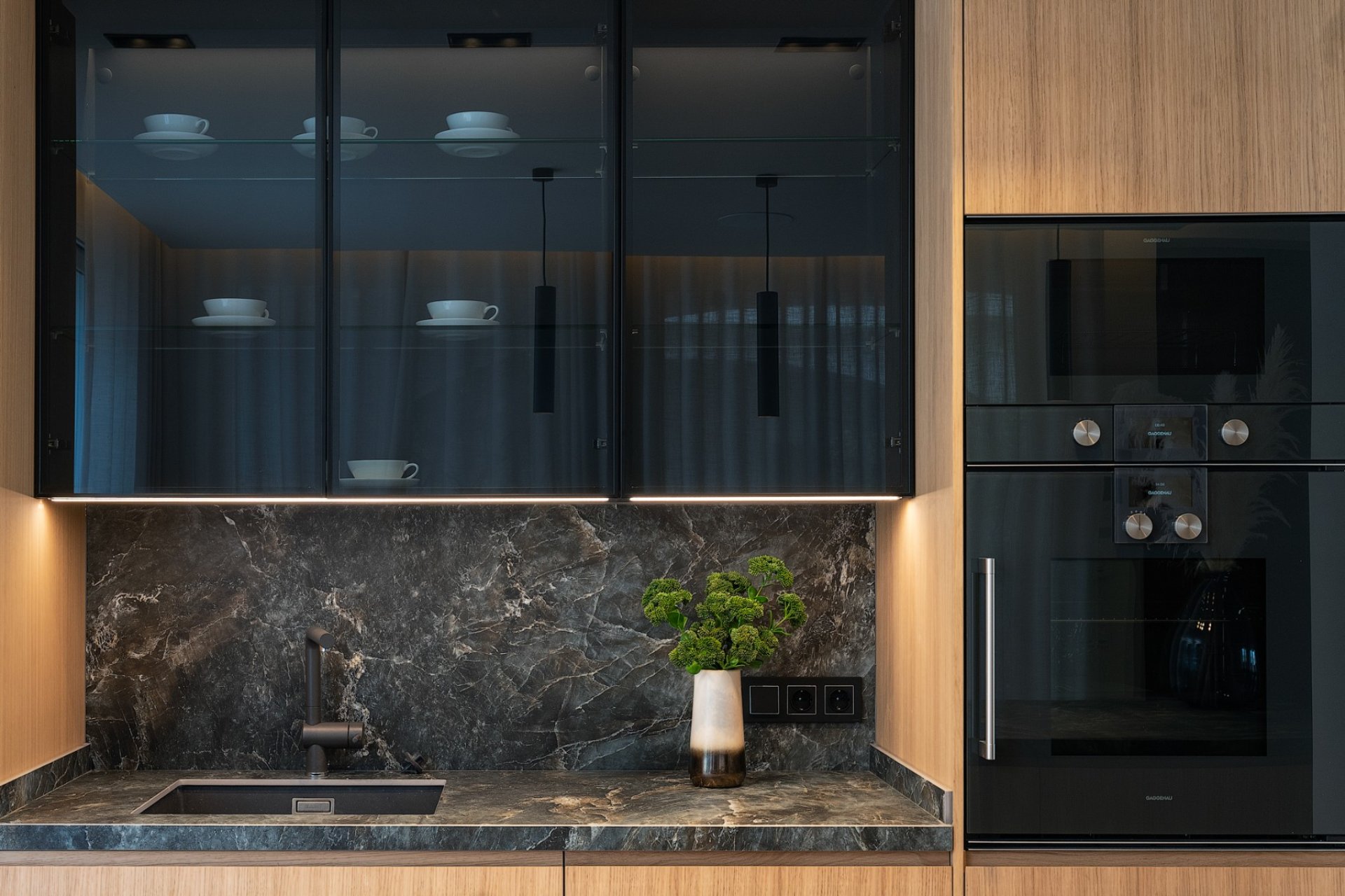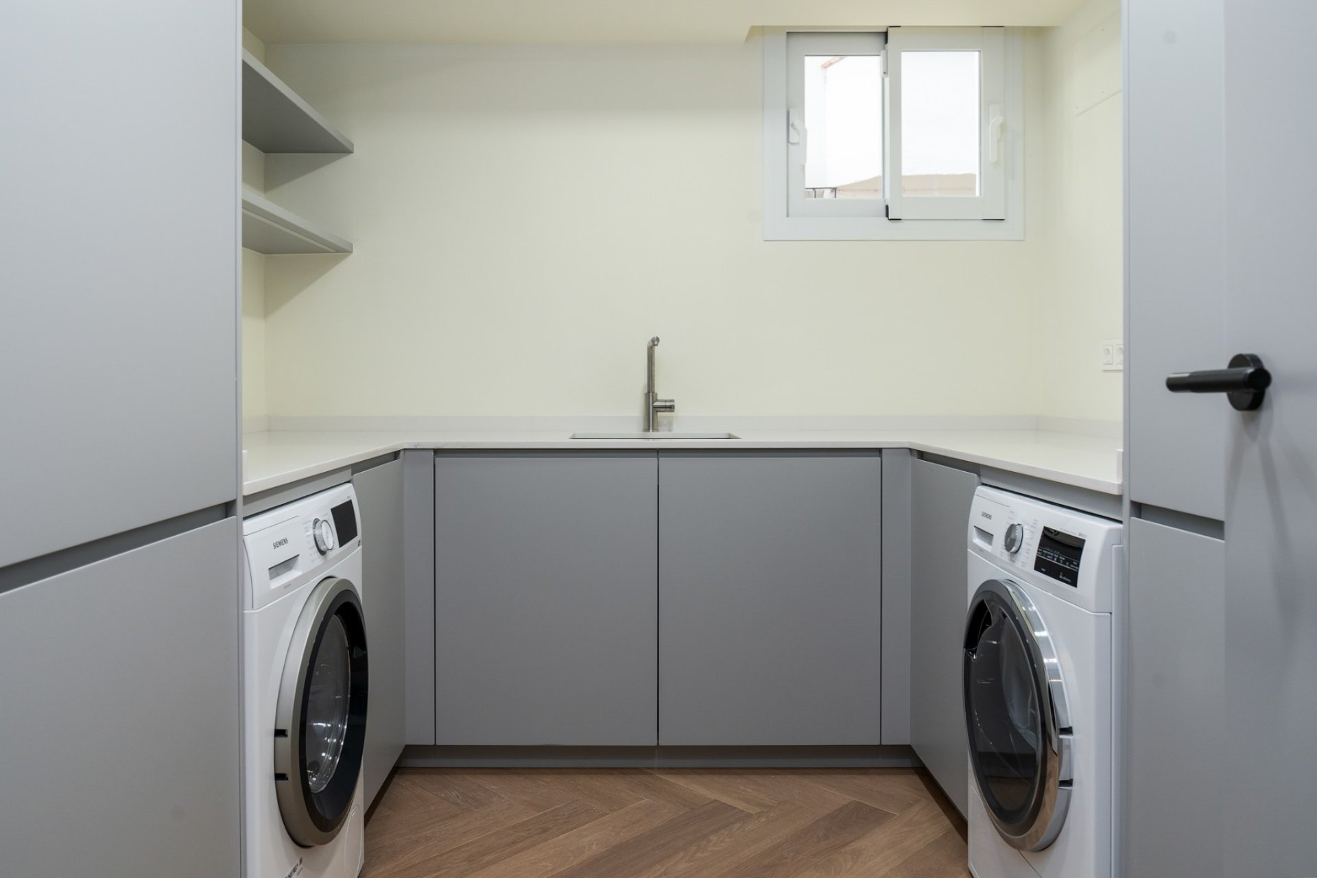 As you enter the property, you will find an open plan fully equipped Gaggenau kitchen with access to a private patio. A beautiful living room and dining space with great attention to detail, wooden herringbone floor and natural color palette. On the same floor, you can find the en-suite master bedroom with walking closet and bathtub facing the main terrace as well as a second bedroom facing the patio.