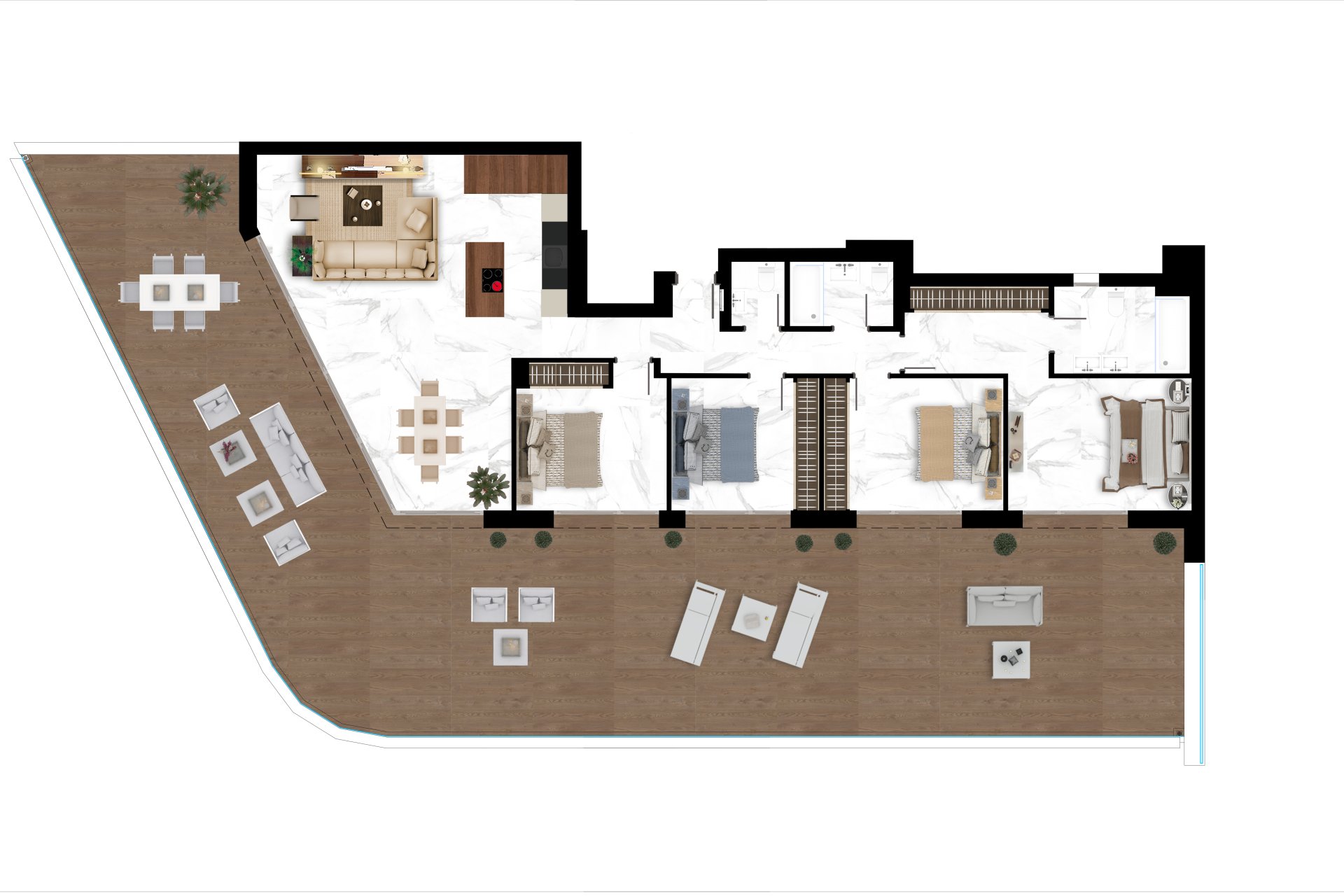 The exterior design of the residential complex in Marbella is meticulously crafted to highlight the surrounding natural beauty. The private terraces are ideal for enjoying the Mediterranean climate and taking in the sea views. The community gardens offer a green space to relax surrounded by nature. The community pool is perfect for cooling off or socializing during the hot summer days. With a privileged location just 1 km from the sea, residents have easy access to beach walks or water activities whenever they wish.