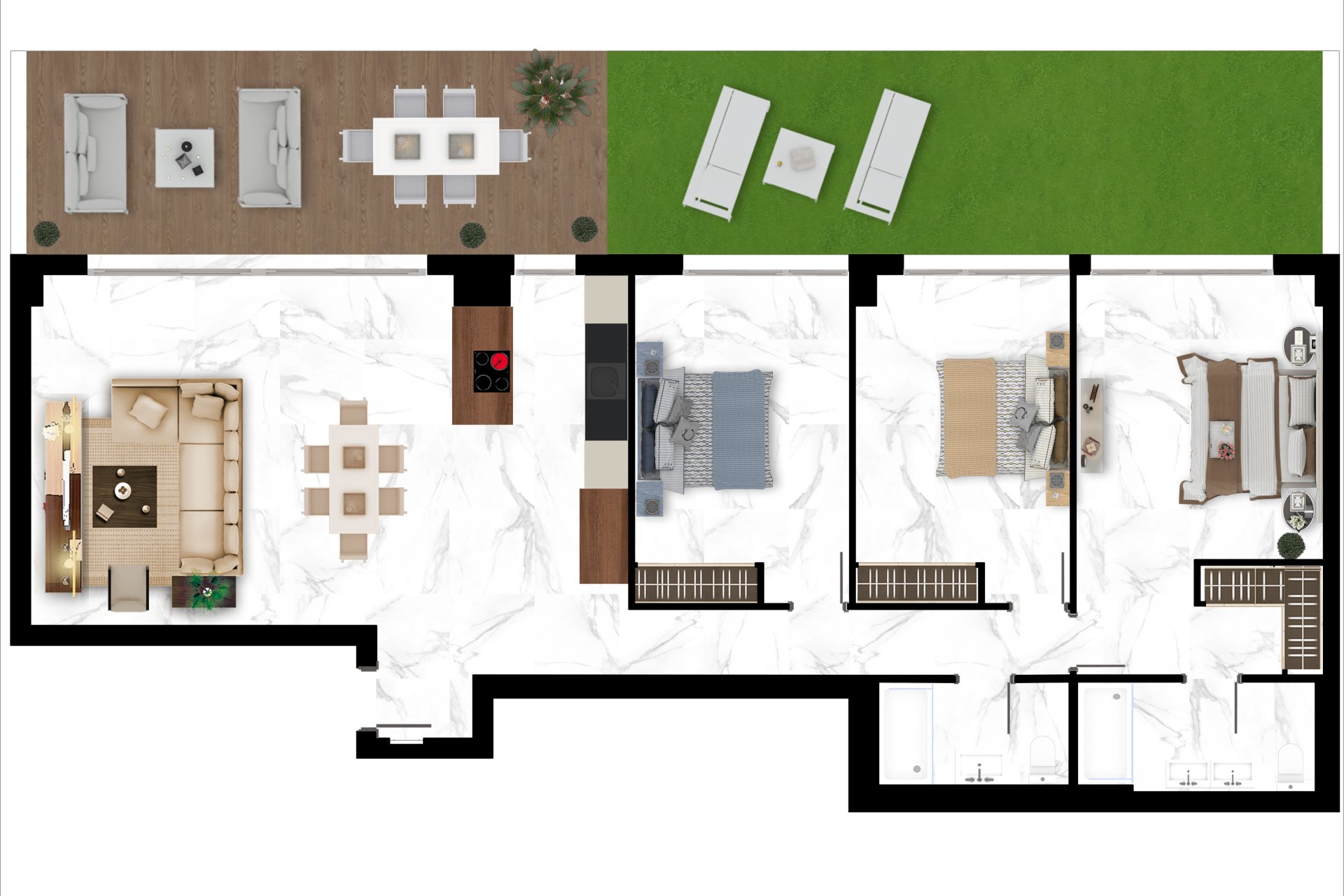This residential complex in Marbella offers homes equipped with high-quality finishes designed to ensure maximum well-being. The porcelain stoneware floors add a distinctive touch and are resistant to daily wear. Comfort is guaranteed thanks to the electric blinds and air conditioning available year-round. The kitchens, fully equipped with modern appliances, facilitate daily tasks while the built-in wardrobes provide generous storage, keeping each room organized. The properties are available in versatile configurations: from options with 2 to 4 bedrooms and bathrooms ranging from 2 to 3 units.