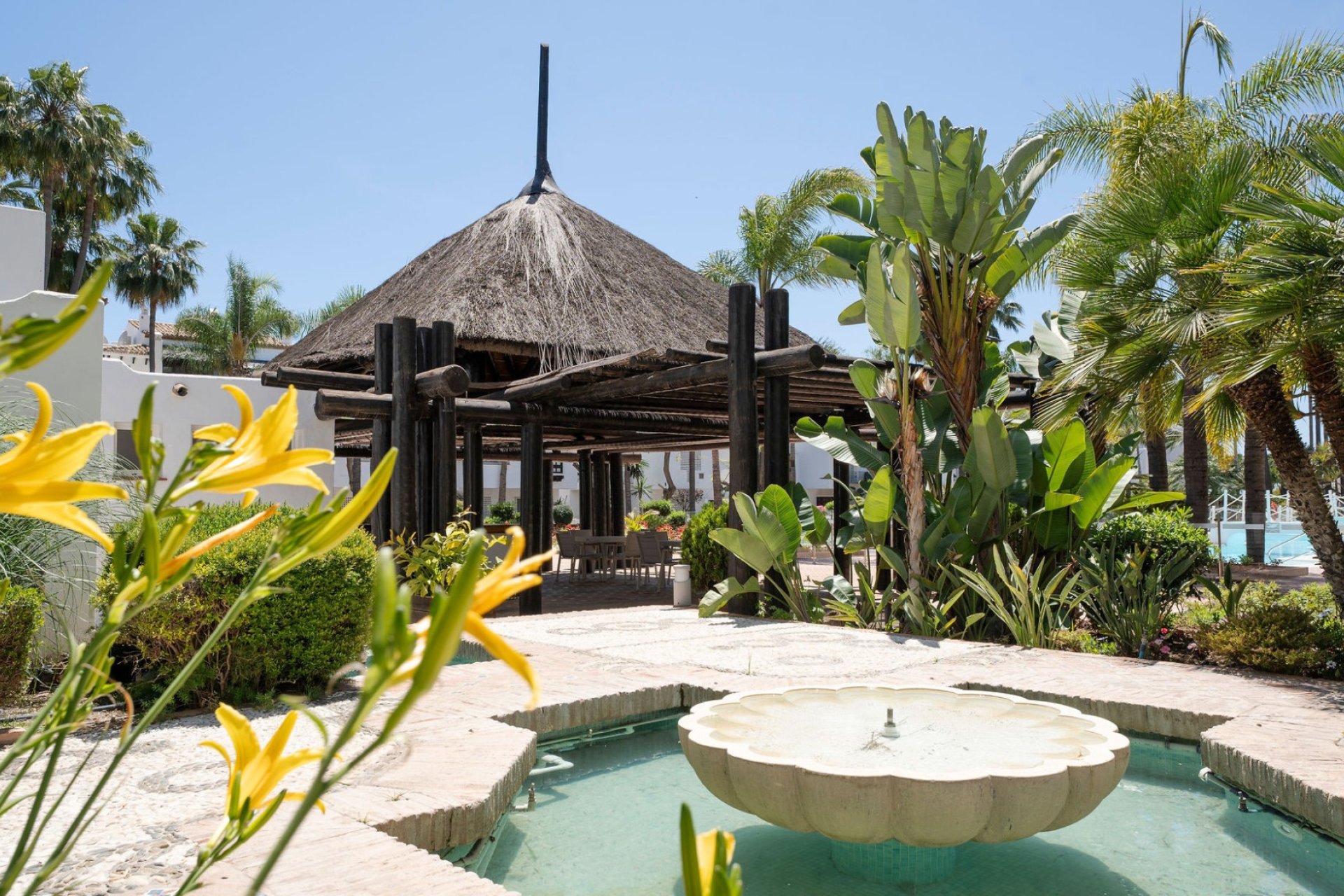 Jardín Persa was established in 1992 and consists of 16 buildings with a total of 84 flats and penthouses. As its name suggests, it is designed to evoke an Arabesque first impression, with features reminiscent of the gardens of the Alhambra in Granada. The urbanization is filled with fountains and irrigation channels that create a continuous and soothing sound of water. The garden leads directly to Marbella’s seafront promenade. It is the only residential complex in the area that is completely enclosed by a fence, providing additional privacy.