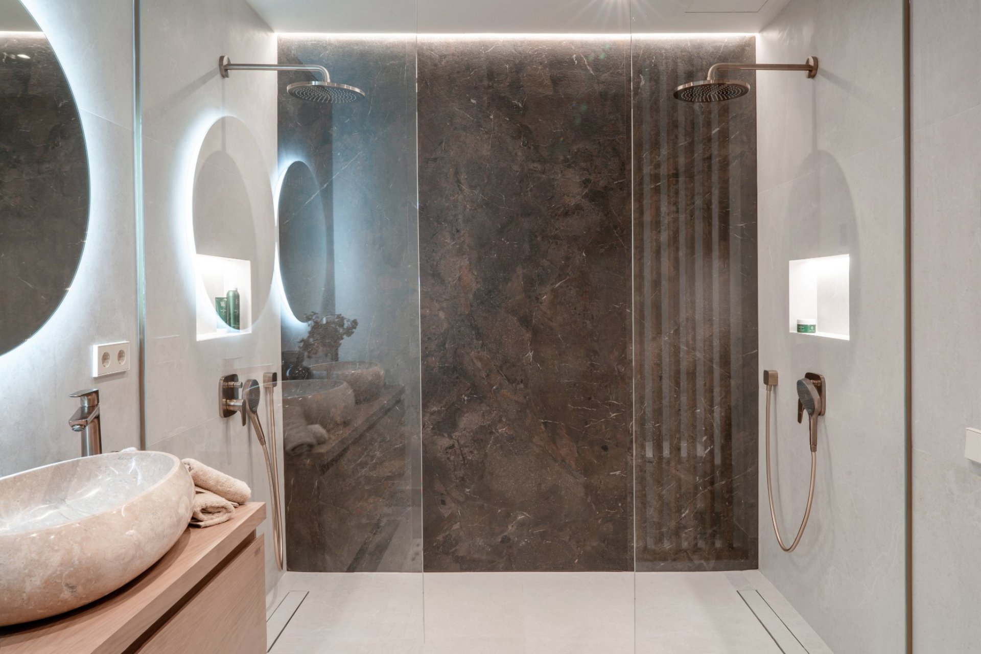 Two of the bedrooms are generously sized, featuring built-in wardrobes with ample storage space. The master bedroom and a second bedroom include en-suite bathrooms, while the third bedroom benefits from a separate bathroom. All the bathrooms are in perfect condition and offer underfloor heating throughout.