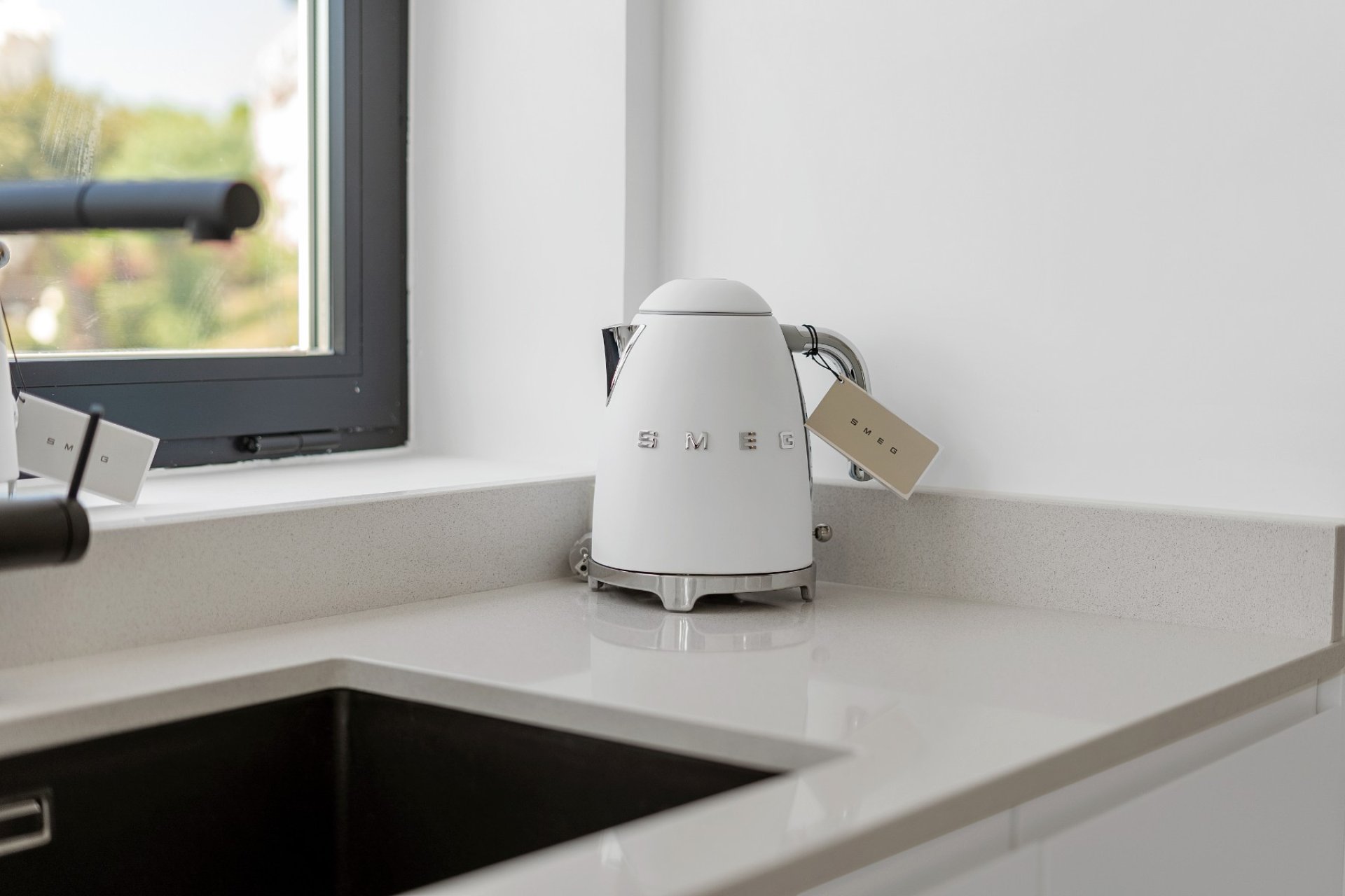 The property provides a harmonious living environment, beginning with a private entrance and staircase. The open-plan kitchen, equipped with brand-new SMEG appliances, adjoins a comfortable sitting area. The first bathroom, concealed behind an innovative wooden door, adds an element of surprise and stylish functionality to the design.
