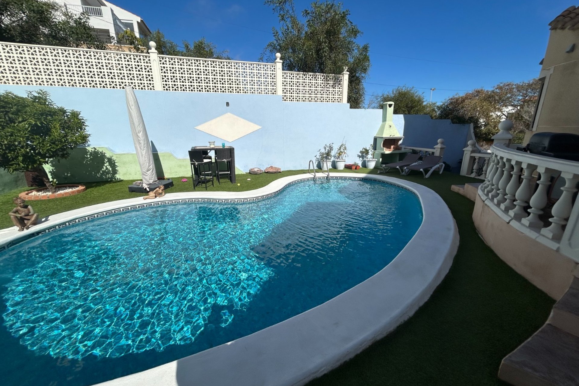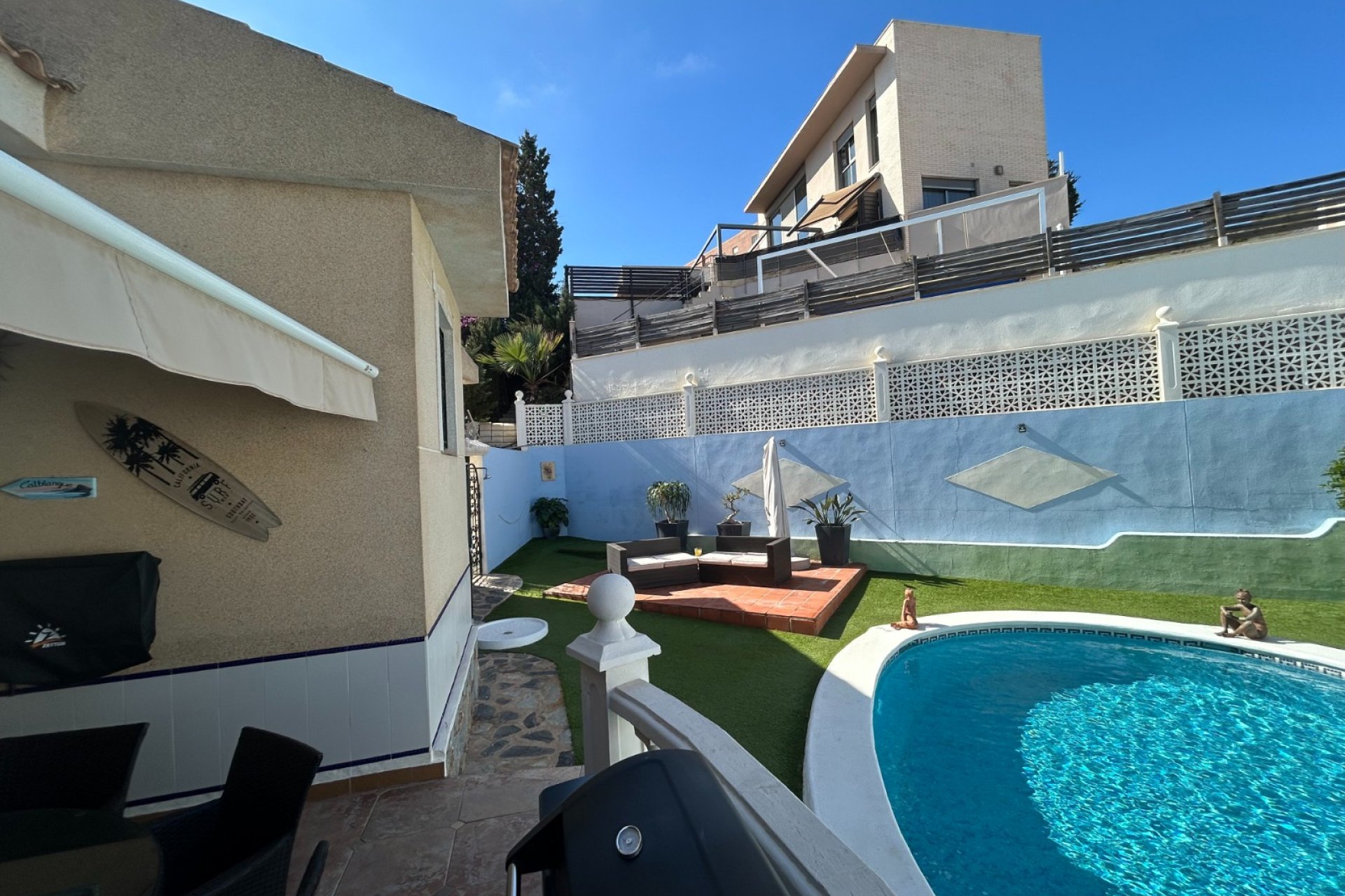 The villa offers a private kidney-shaped swimming pool surrounded by artificial grass, an outdoor shower and a poolside barbecue area, ideal for enjoying the Mediterranean climate. Front and rear terraces create different outdoor environments, while the covered terrace with sun protection is perfect for relaxing at any time of the day.