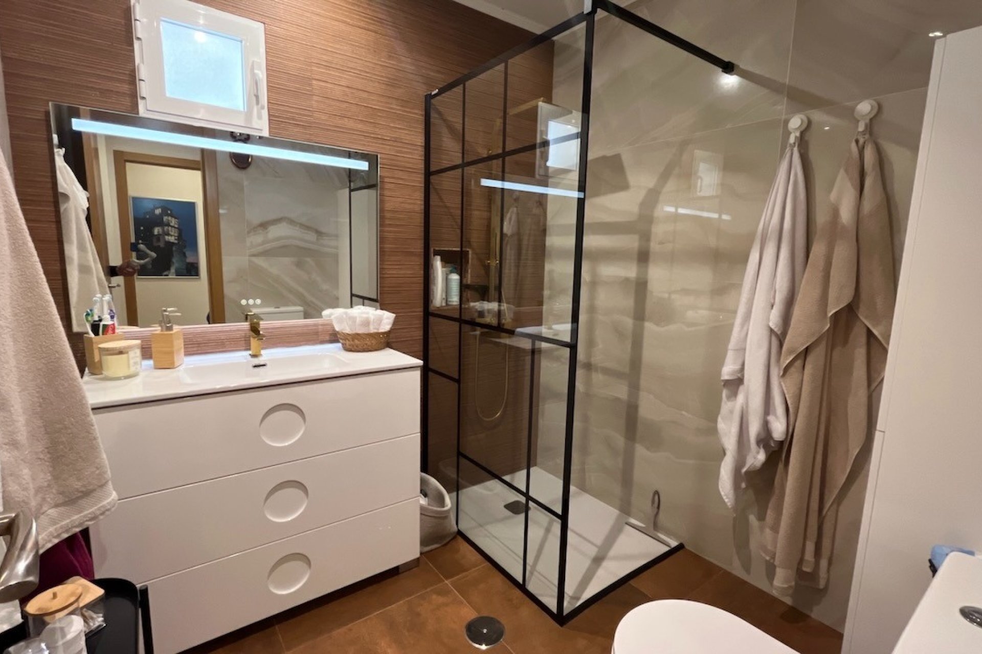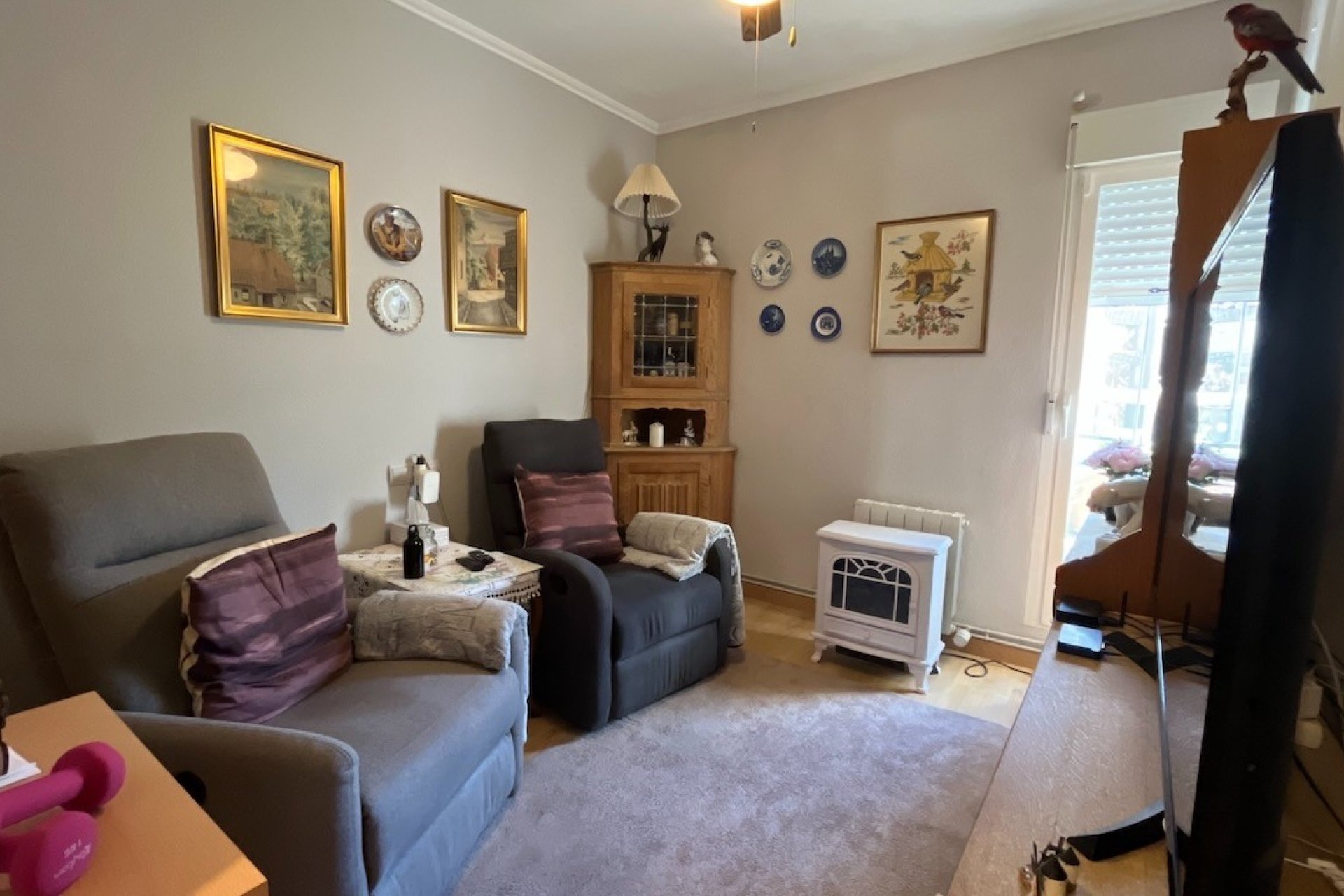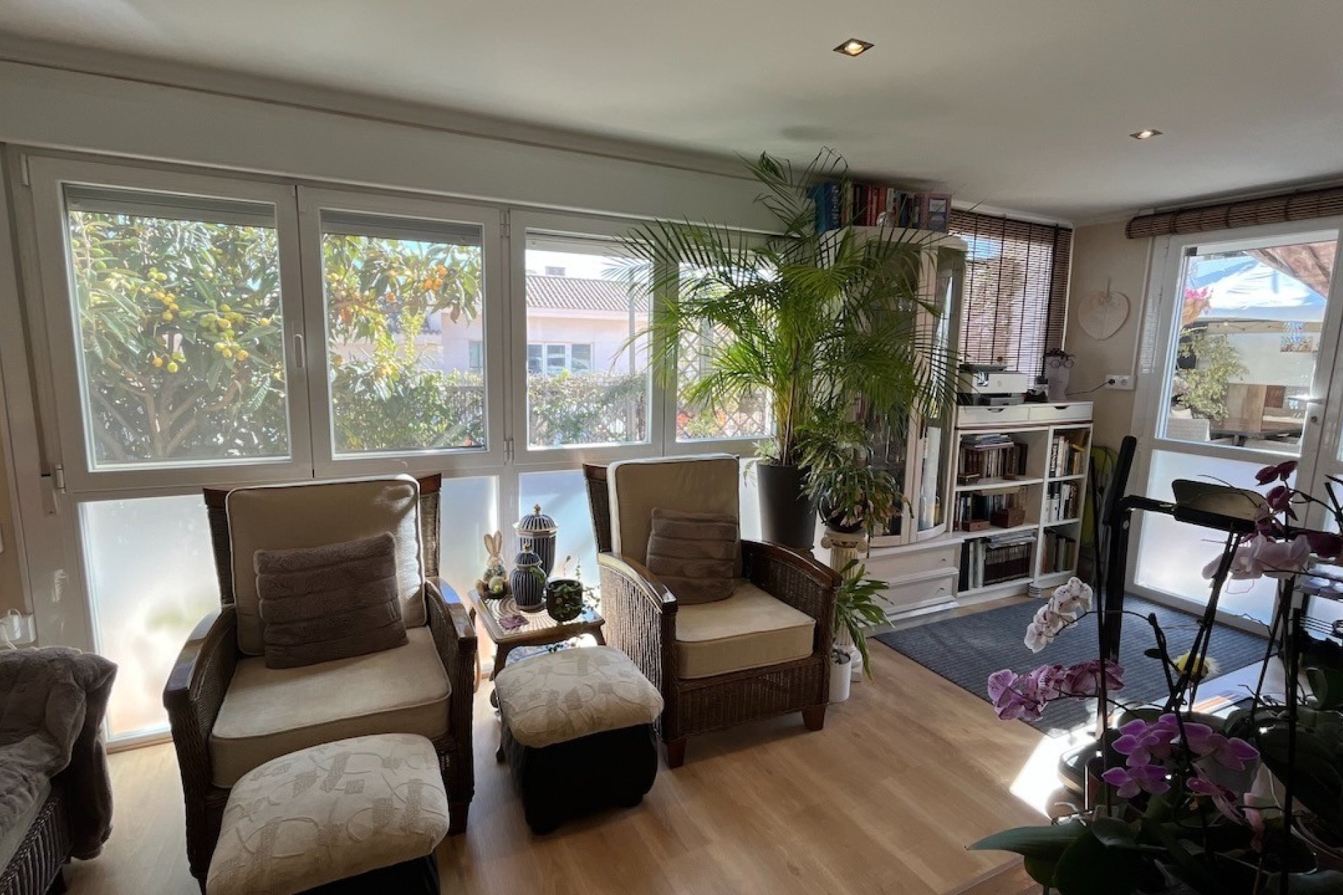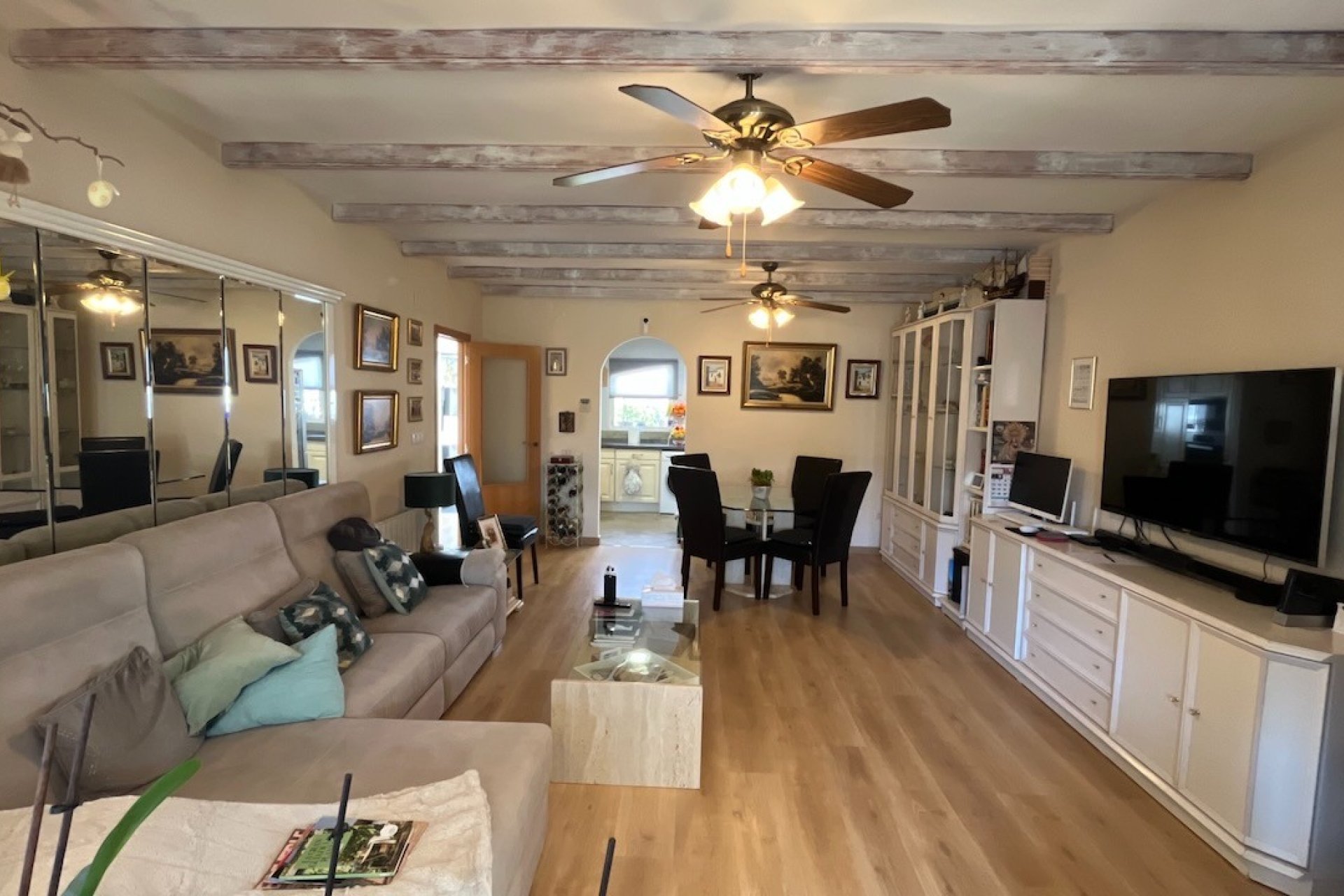 Nice semi-detached villa for sale in La Nucia, all on one floor and without stairs. It is located in a quiet urbanisation approximately 6 km from Benidorm, and 2 km from the village. Quiet area with access to a small supermarket, bar and restaurant within walking distance, or a 15-20 minute walk to the town centre. 3 large bedrooms, 2 bathrooms, one of them ensuite, and a large living-dining room with a glazed terrace connected to the living room, with lots of light. Independent kitchen, which could be opened to the living room if you wish, exterior terrace with open terrace, a small storage room, and a large solarium on the top, with sea and mountain views. The house also has solar panels, and currently pays very little if any electrical bills. Gated urbanisation with few neighbours, and a nice communal pool. For more info and viewings, please do not hesitate to contact us.