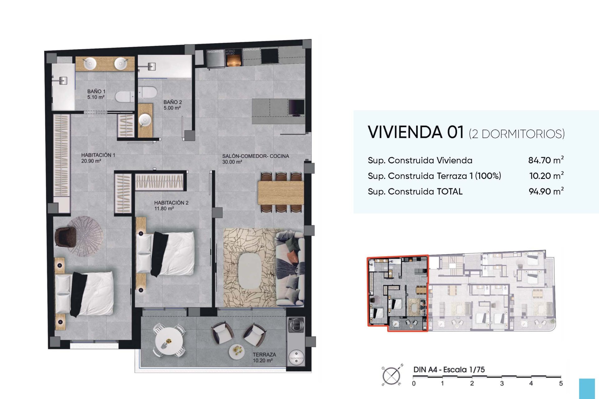 This development offers homes designed with attention to detail, combining quality and comfort. The apartments and penthouses feature porcelain stoneware floors that provide durability and elegance. With two bedrooms and two bathrooms per unit, they are ideal for both families and couples. The kitchens come equipped with modern appliances, while the pre-installation of air conditioning ensures a pleasant climate year-round. The private terraces offer a serene space to relax.