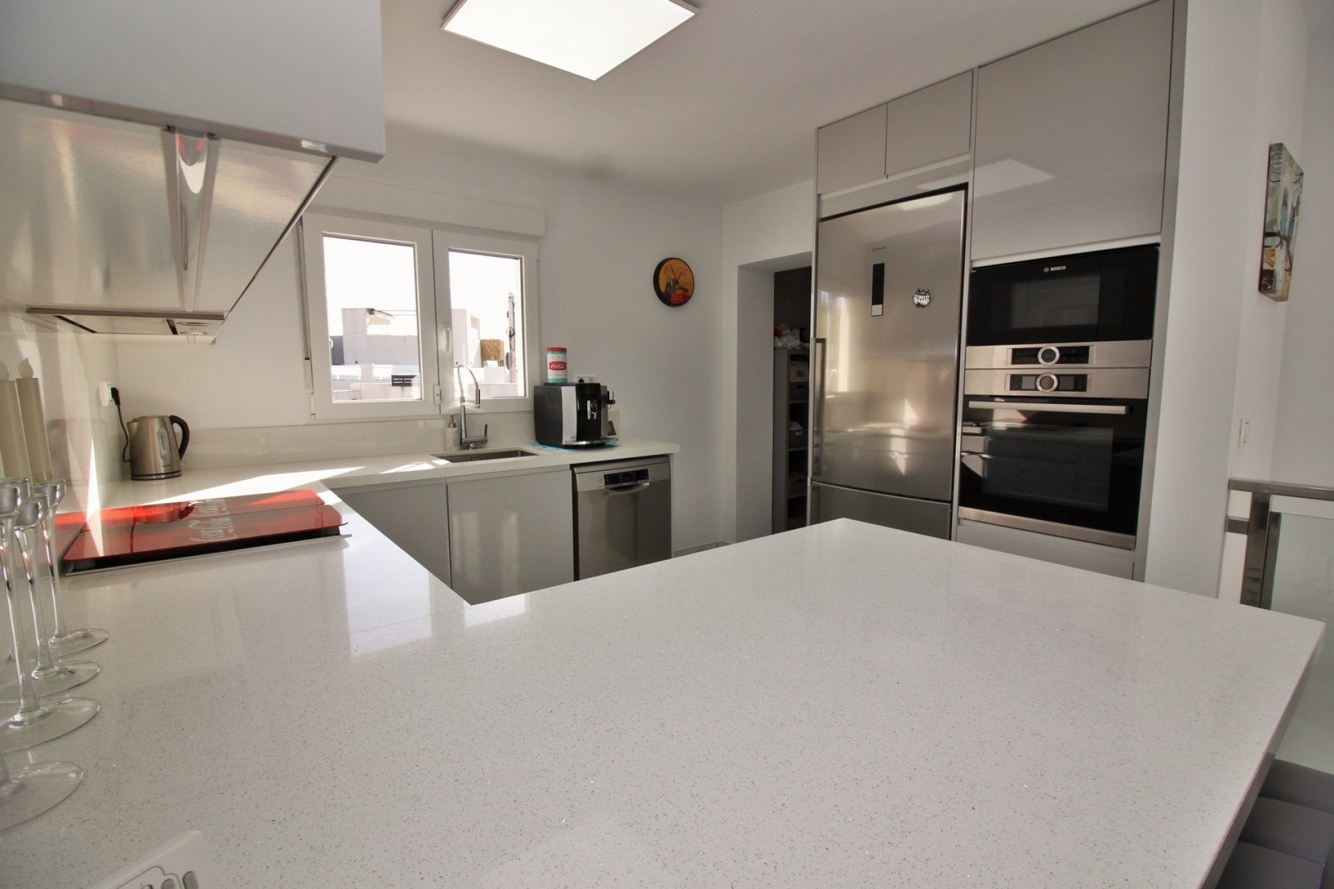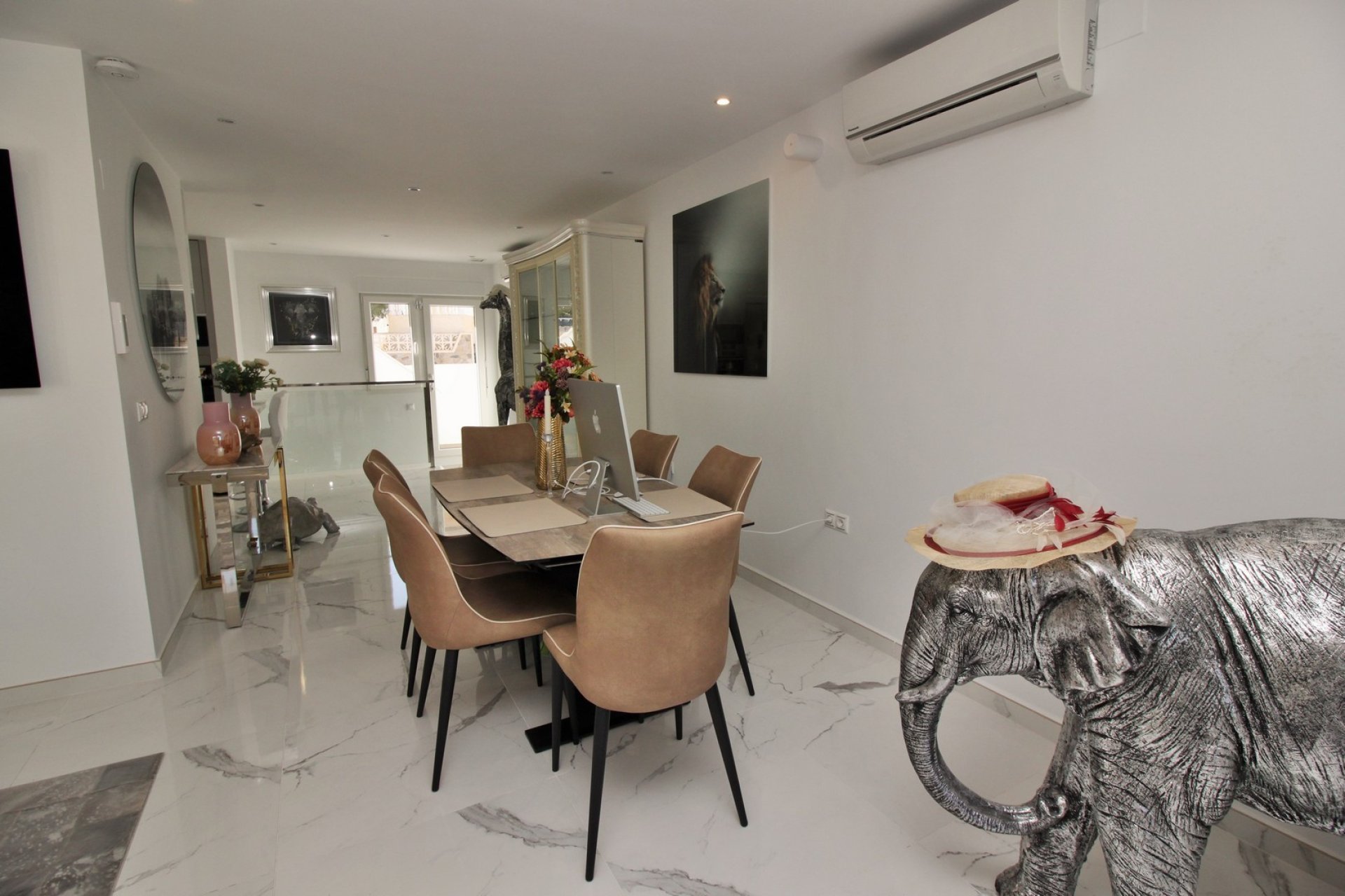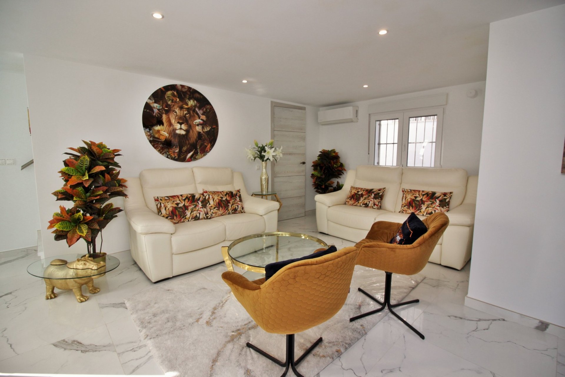 Fully renovated and South facing detached villa for sale in Blue Lagoon, Villamartin. The villa sits on a 361m2 plot and has been completely renovated throughout including new flooring, bathrooms, kitchen, doors, windows, plumbing, electrics and drainage. There is also a large heated pool with retractable dome cover perfect for all year round use! Plus a summer kitchen completed with built-in BBQ and covered carport with electric gates. The villa needs to be viewed to truly appreciate every detail that has been renewed and modernised. The living accommodation is divided over 2 floors with the upper floor comprising of a bright and spacious lounge area with open kitchen, utility room and bathroom with walk-in shower. Internal stairs leads down to a further lounge area with direct access to the garden and pool area. On the lower level there are 2 good sized bedrooms, a modern bathroom with walk-in shower, utility closest, and an additional storage/utility area, which also benefits from direct access to the pool area. The villa has a large roof solarium which has been partially enclosed for all year round use. The roof terrace offers lovely views of the Torrevieja salt lakes. Sold partially furnished with white goods, air-conditioning and gas central heating throughout. No expense has been spared on this property! Located just 400 metres from the local bars, restaurants and convenience store opposite the Blue Lagoon arch. There are several championship golf courses all within easy reach by car. The Zenia Boulevard shopping mall, and the sandy blue flag beaches of the Orihuela Costa are just a 10 minutes drive away.