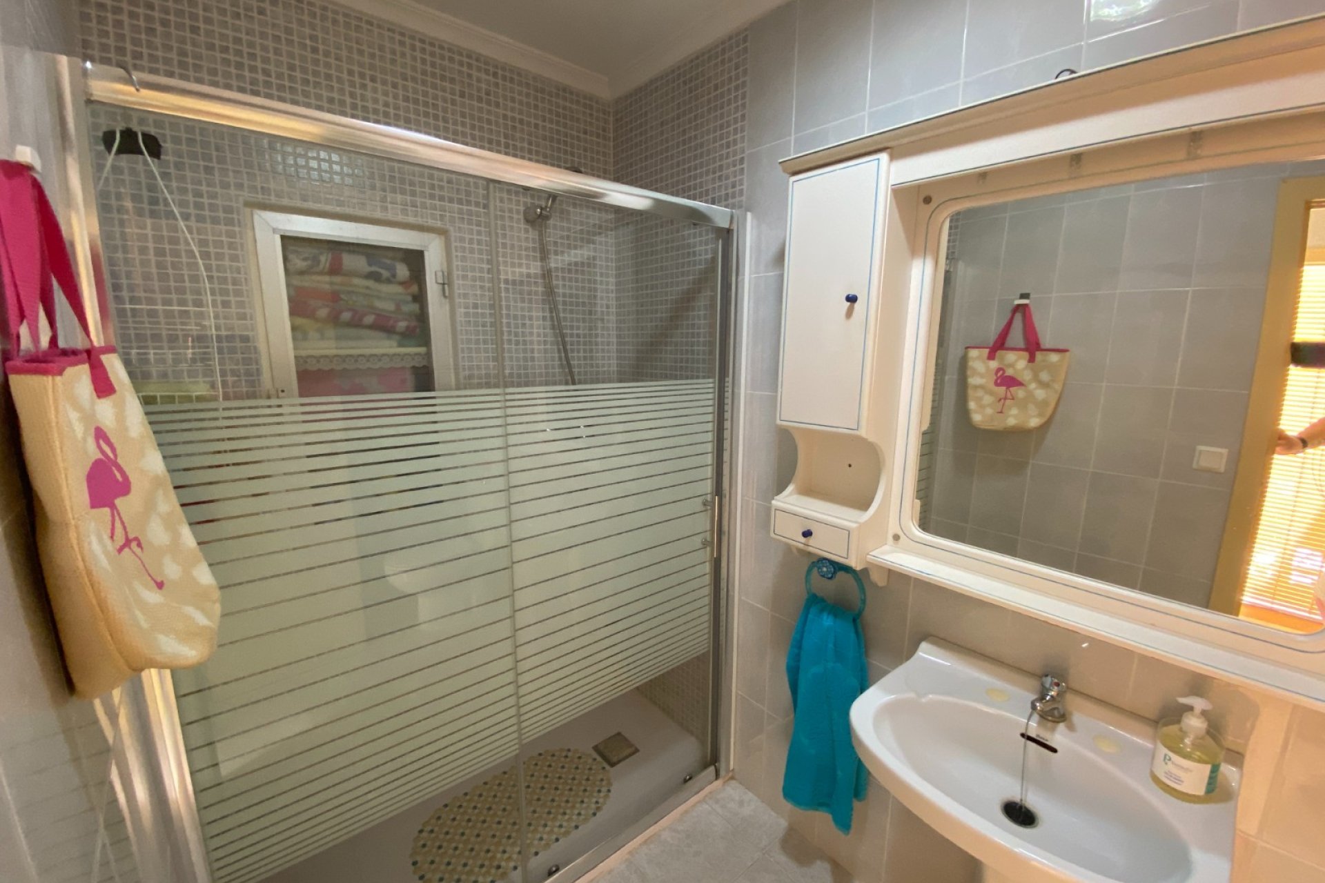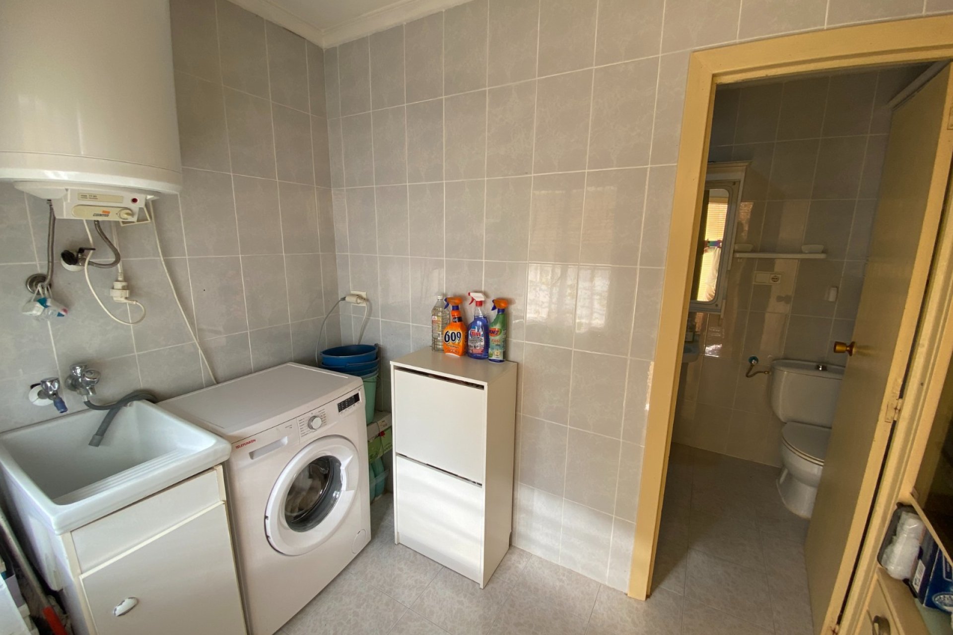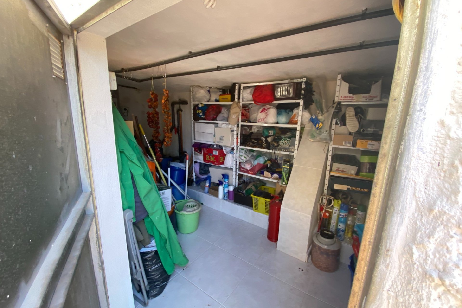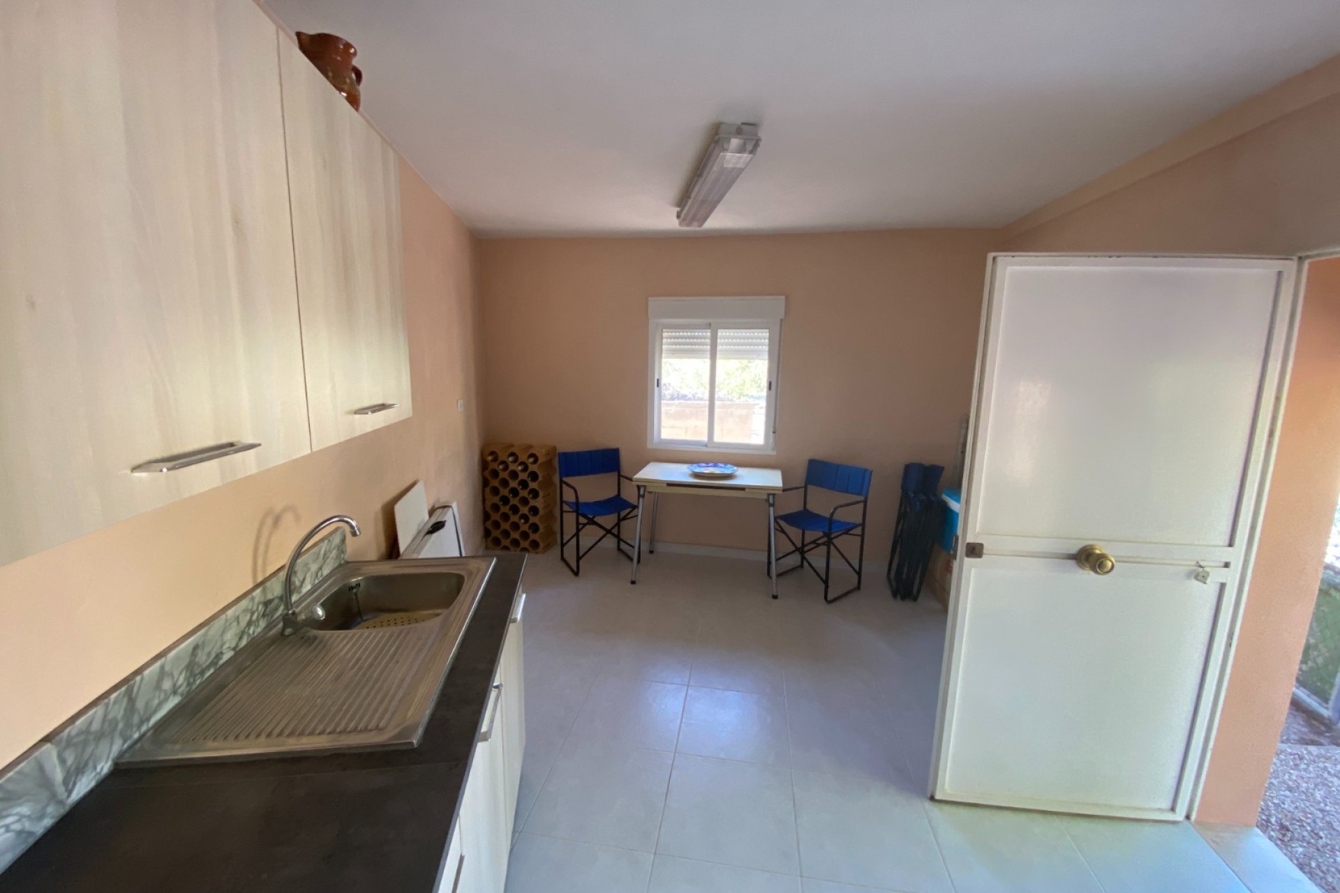 Opposite the entrance is another smaller metal door which, when open, you can see the storage space for the pump and filter for the swimming pool and even more space for strong stuff. A little patio area with a table and chairs offers outside dining.