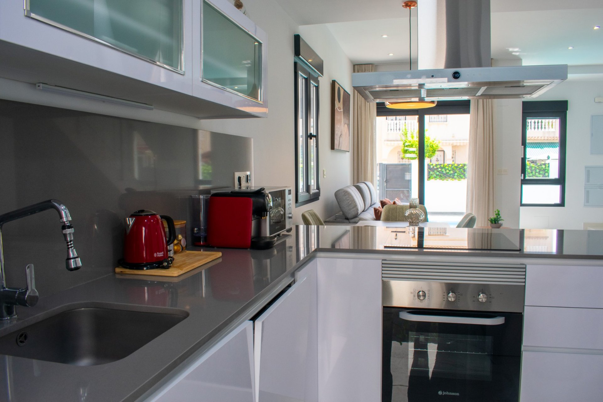 With a plot of 116 m² and 106 m² built area , the property is spread over two floors. On the ground floor, a bright living-dining room with an open kitchen , a double bedroom , and a full bathroom allow for comfortable living on one level. Upstairs, there are two spacious bedrooms with en-suite bathrooms and direct access to a private solarium with stunning views of Torrevieja's Pink Lagoon .