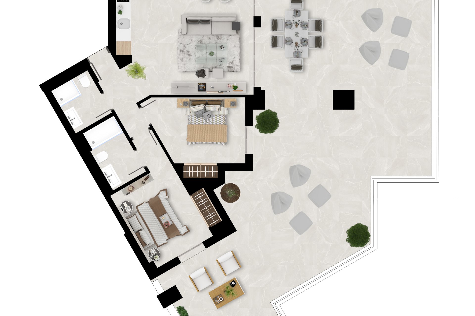 The homes in this development are designed with modern comfort and practicality in mind. Available in configurations of two or three bedrooms with two bathrooms, each apartment, ground floor, or penthouse is equipped with integrated appliances and built-in wardrobes that optimize the available space. All properties feature a private terrace that offers a special place to enjoy the Mediterranean climate and panoramic views. The penthouses have an additional solarium ideal for leisure moments.