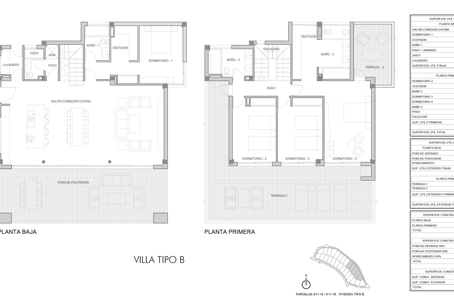 The interior of these villas combines luxury and functionality. With four bedrooms and four bathrooms, they offer generous and cozy space. The porcelain tile floors add a modern touch while the home automation systems ensure a smart home. Kitchens equipped with premium appliances and built-in wardrobes maximize daily comfort.