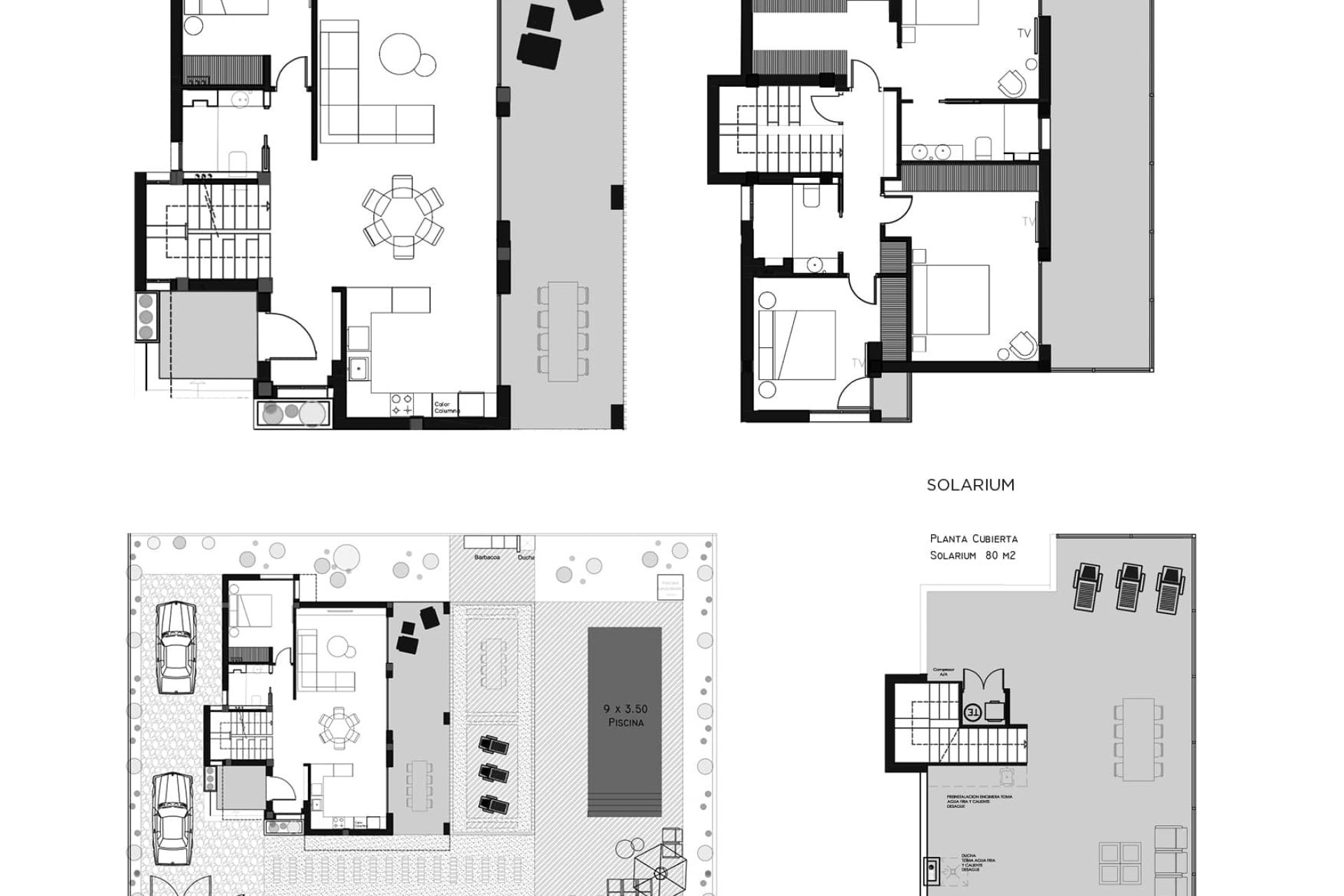 The exterior of these homes is a true oasis of relaxation. Each property features a private garden, perfect for enjoying the Mediterranean climate. The presence of a private pool adds a touch of luxury, allowing for a refreshing dip on the hottest days. Additionally, the terraces and solarium offer additional outdoor leisure spaces, ideal for family gatherings or simply enjoying a moment of tranquility. The pergola provides shade and a cozy spot to rest during the intense sun hours.