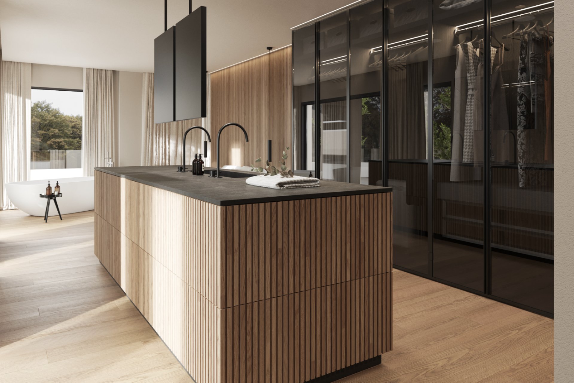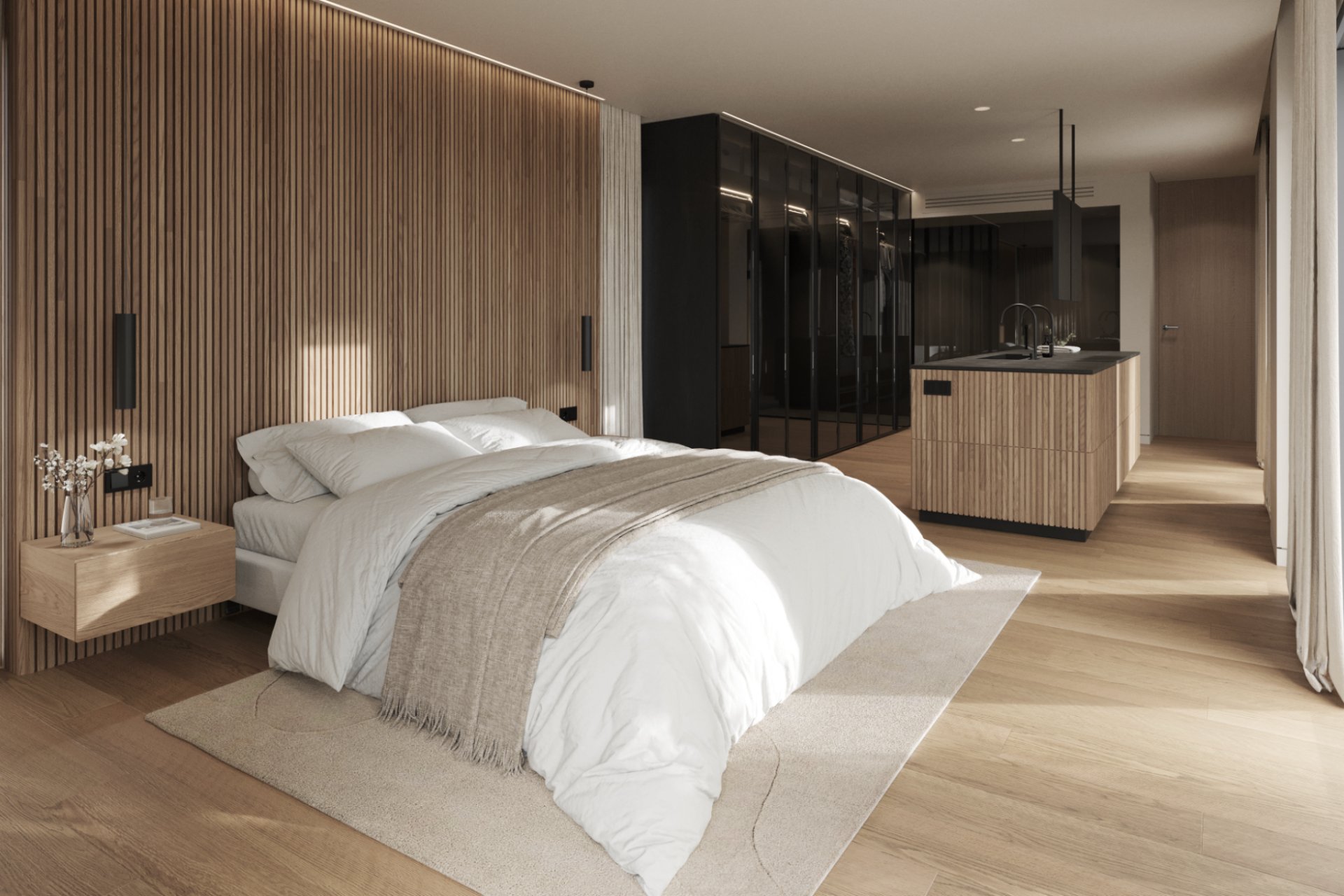 Upstairs , the nearly 40 m² master suite becomes a true sanctuary of well-being, with a dressing room , private bathroom , and a freestanding bathtub with sea views . This floor is flanked by two additional bedrooms with en suite bathrooms and a practical laundry and ironing area.