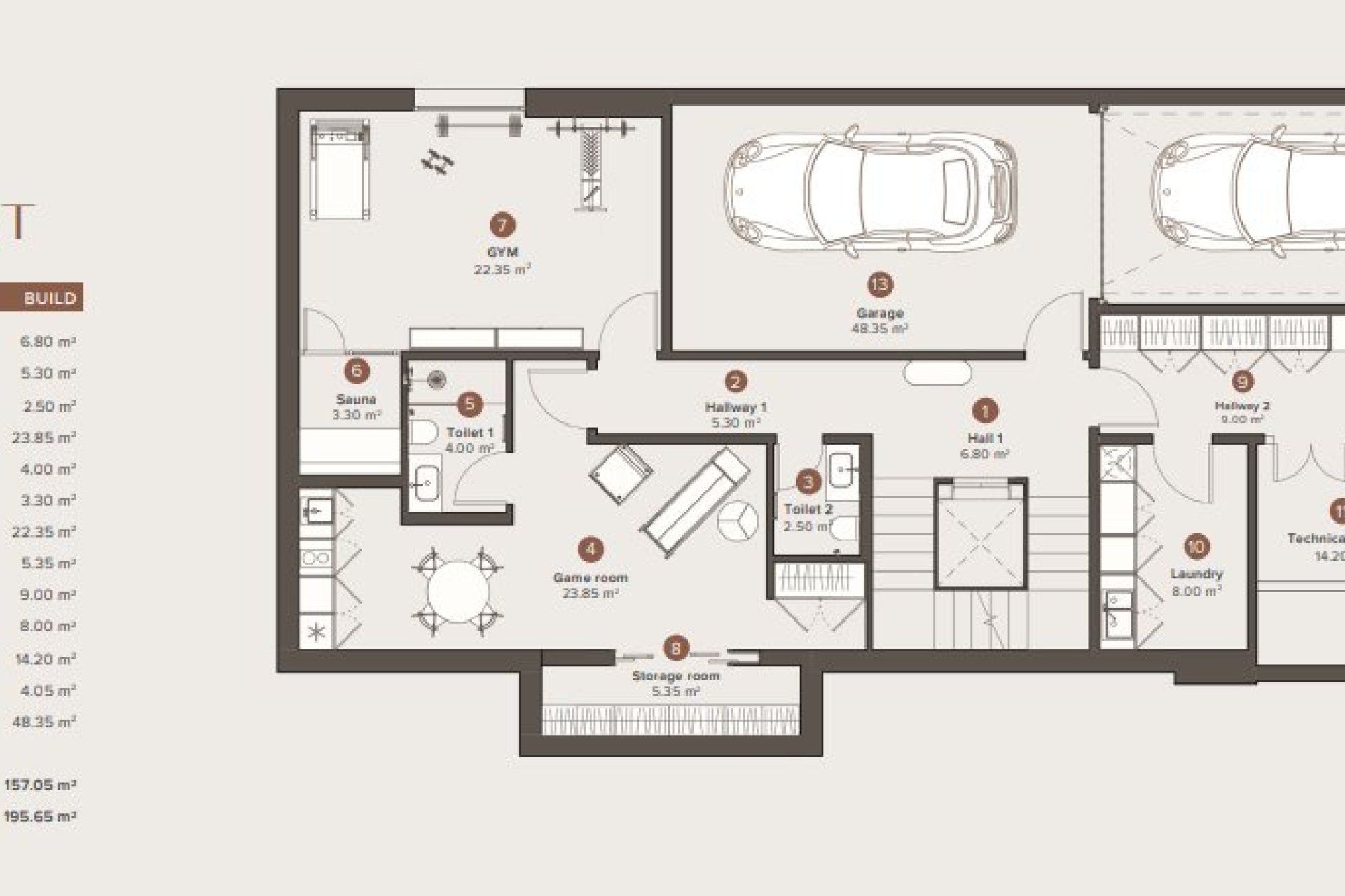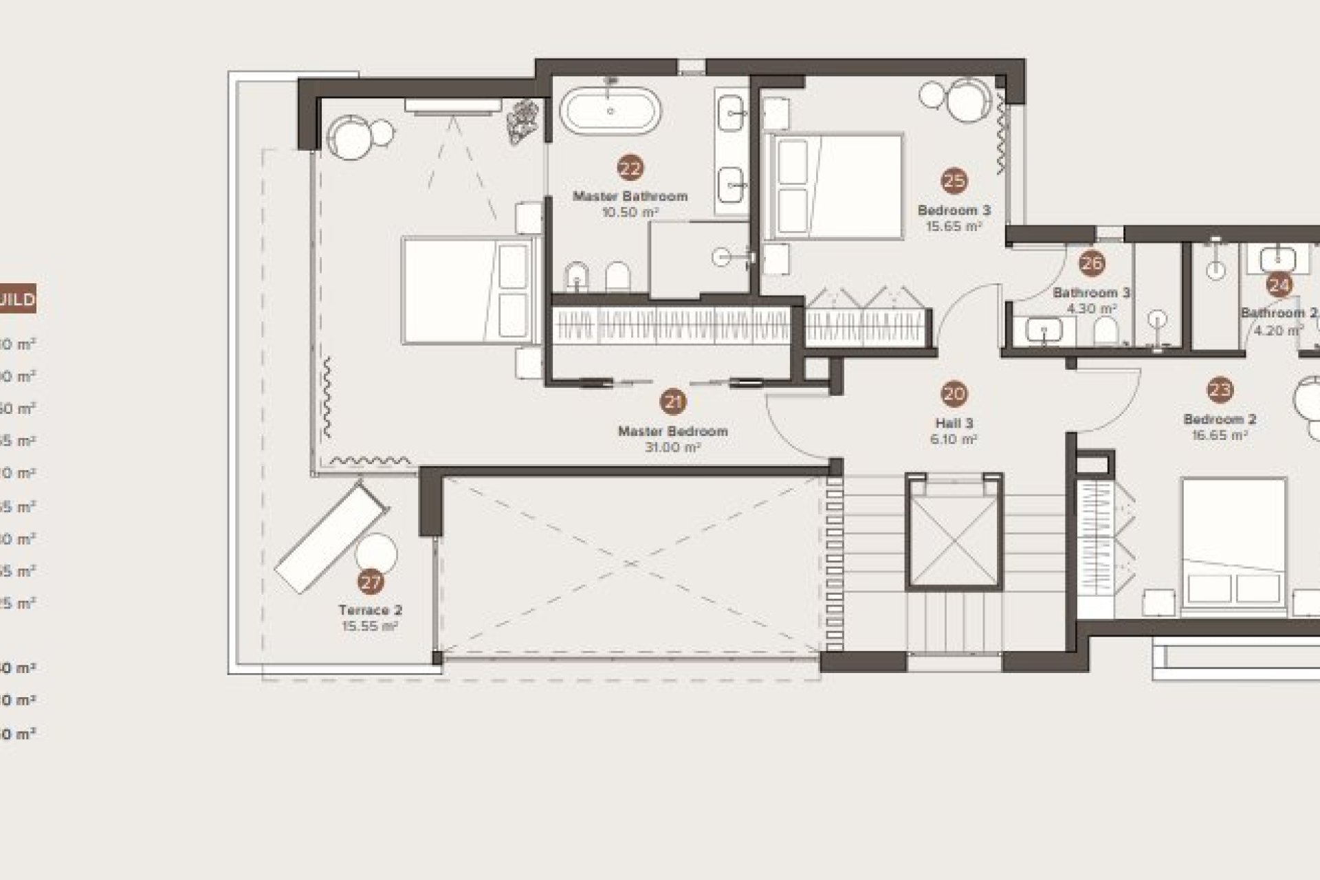 The interior of these stunning villas has been designed with comfort and elegance in mind. With four bedrooms and four bathrooms, each space is optimized to offer functionality and spaciousness for the whole family. The porcelain tile floors add a modern and sophisticated touch. The built-in wardrobes provide efficient storage solutions, keeping the design clean and tidy. Furthermore, each villa includes a private garage, ensuring convenience and protection for your vehicles.
