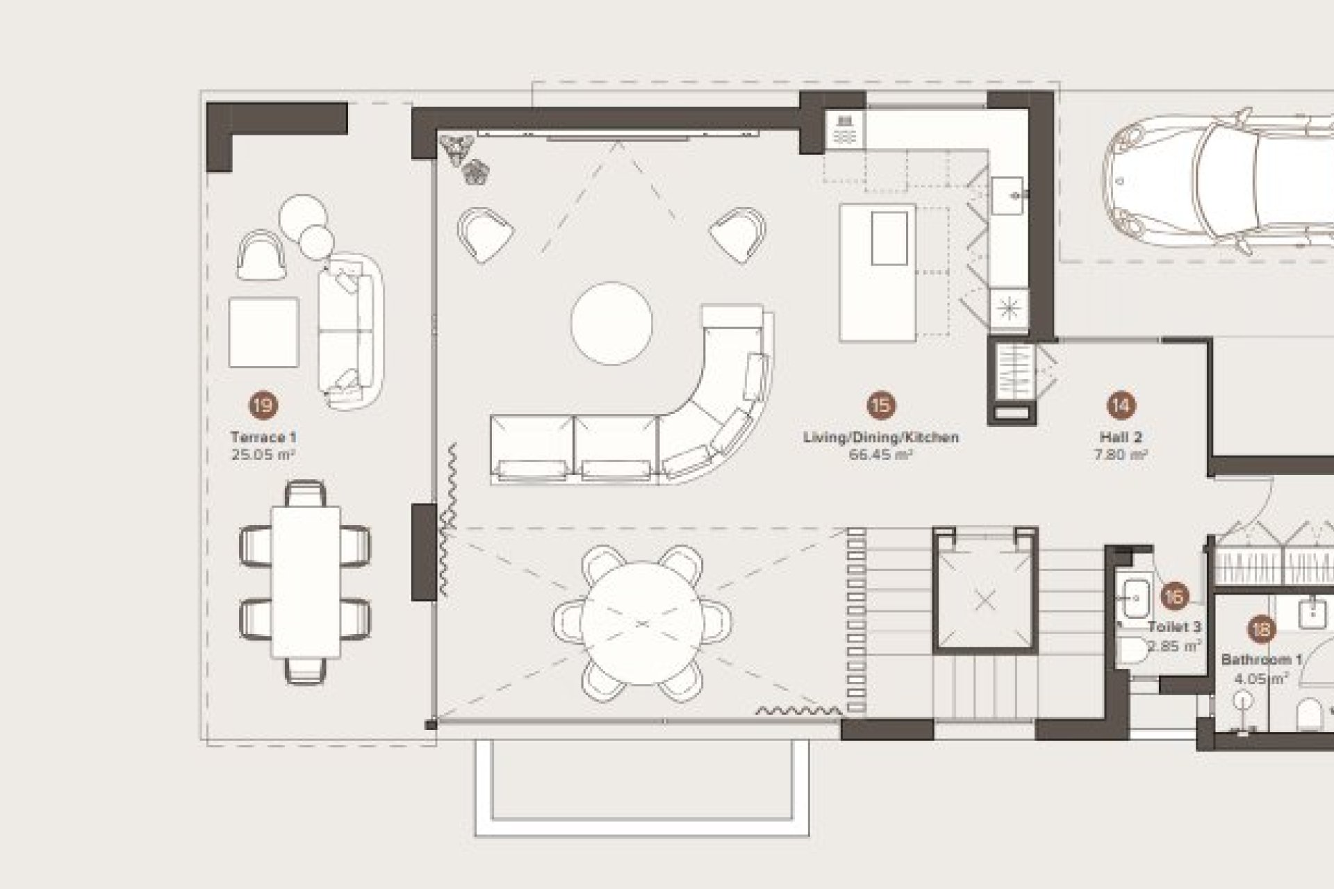 Enjoy the Mediterranean climate outside these villas, where each property features a private garden ideal for creating your own retreat. The spacious terraces are perfect for outdoor entertaining or relaxing with sea views. A solarium adds an extra touch of luxury, allowing you to enjoy the sun year-round. Additionally, each villa has a private pool, perfect for cooling off on hot days.