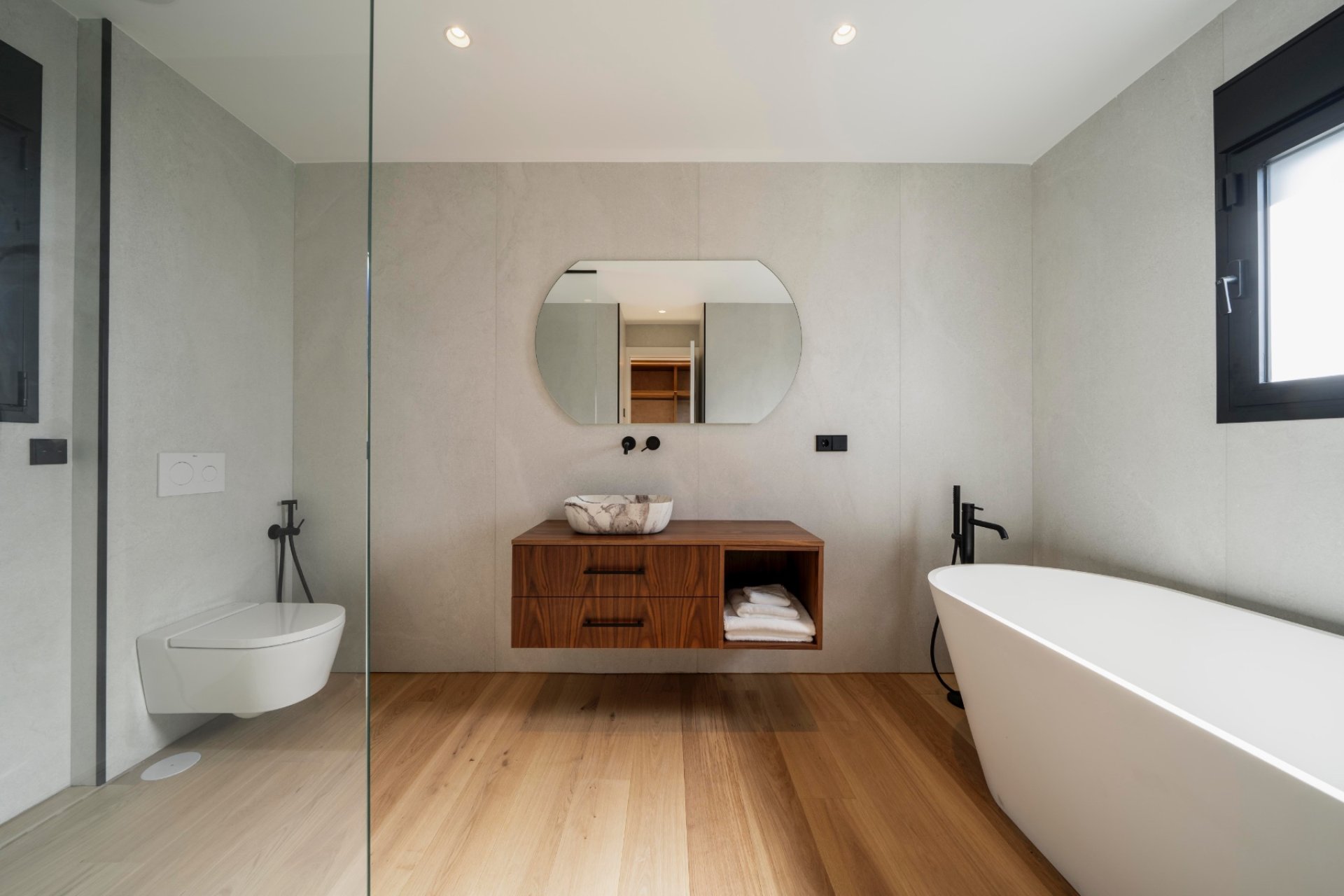 Below the pool, a separate apartment features a bedroom, bathroom, and kitchenette—ideal for guests or staff. The property also offers a covered garage, space for three more cars, and a separate area with a wine cellar, gym, and bathroom.