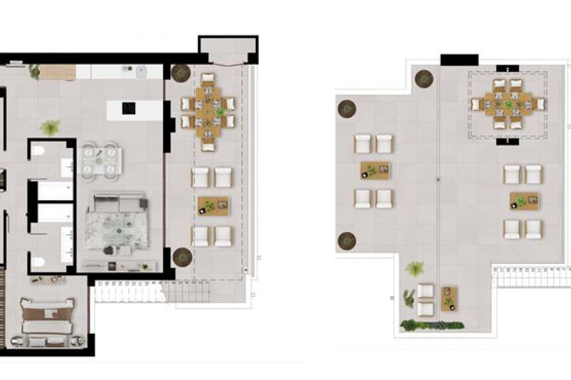 The exterior of this development in Cerros del Lago has been conceived as an oasis where nature and comfort coexist harmoniously. The homes feature private terraces perfect for enjoying the Mediterranean climate alongside stunning sea views. The penthouses offer additional solariums, ideal for moments of relaxation or entertainment under the open sky. Surrounded by generous green areas, the community provides a serene environment for walks or outdoor activities. Additionally, it has private parking ensuring safety and convenience for residents' vehicles.
