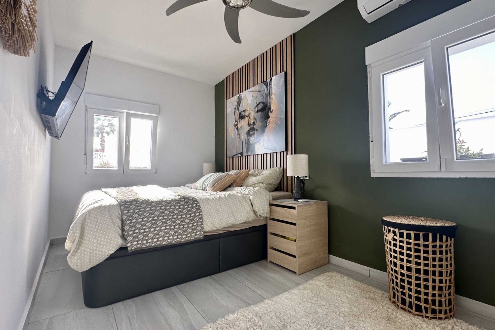 Discover a beautifully renovated, contemporary detached villa located in the residential heart of Ciudad Quesada, Rojales. This stylish home combines modern design with comfortable living spaces across two levels, set on a generous plot of approximately 500 m². The property is ideal for families seeking spacious accommodation or as a desirable holiday residence. The villa offers a built area of 132 m² and features five well-sized bedrooms and three modern bathrooms, giving plenty of room for family, guests, or flexible living arrangements. The layout flows around bright, open-plan living areas that seamlessly connect to outdoor terraces and garden spaces — perfect for enjoying the Mediterranean climate. Externally, the home boasts an elegantly landscaped garden with paved terraces designed for outdoor living and entertaining. A standout feature is the private heated pool (8 × 4 m), providing year-round enjoyment. The outdoor space also includes a covered exterior kitchen/bar area, ideal for al fresco dining and social gatherings. Additional highlights include air conditioning in all rooms, built-in wardrobes, south-facing orientation for excellent natural light, and a garage space. The property is finished to a high standard with contemporary touches throughout and is located in a quiet, sought-after neighbourhood