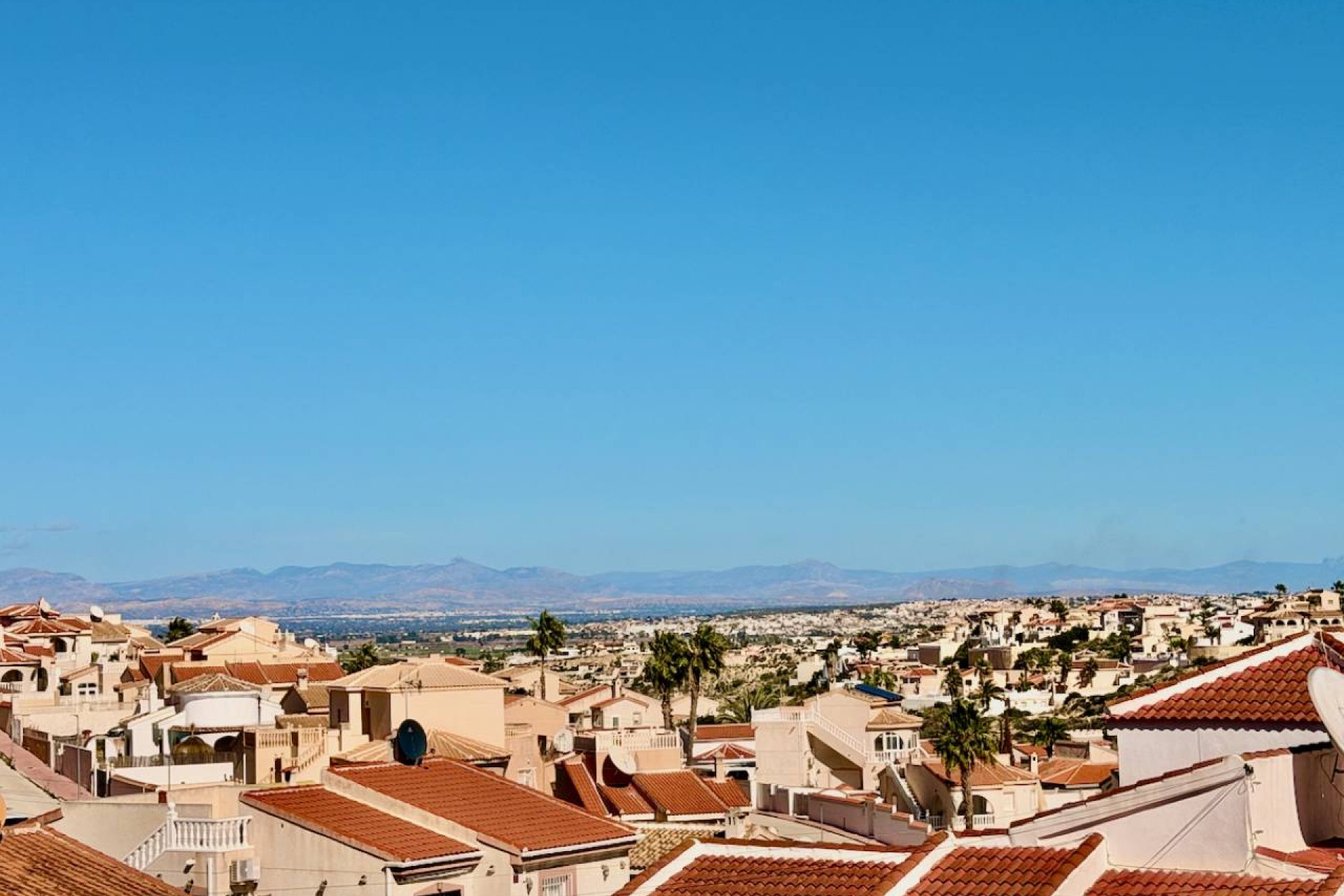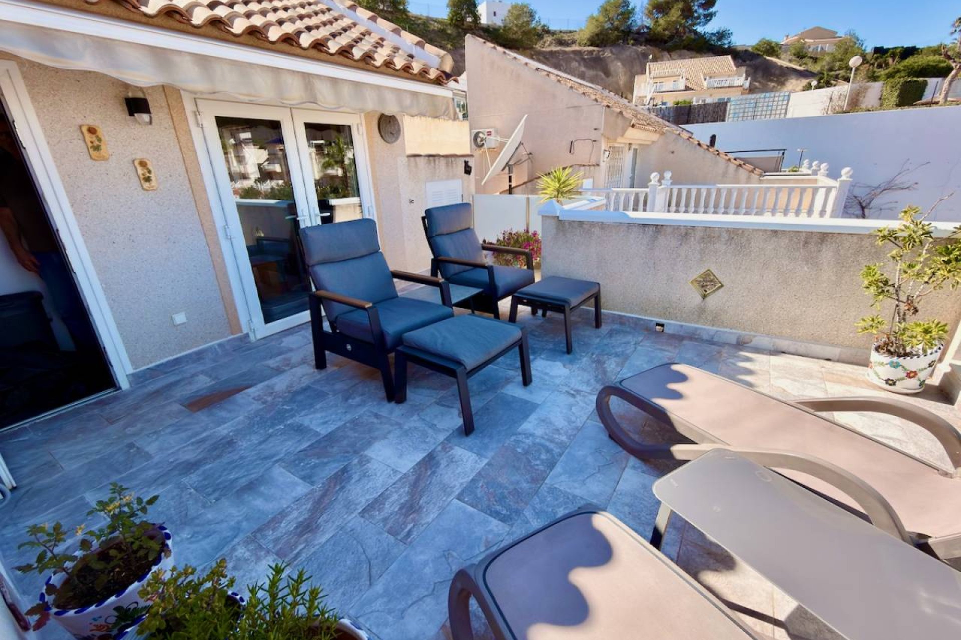 The villa features a bright, functional layout with a fully equipped kitchen, a utility room, and spacious living areas that open onto a private, glazed terrace overlooking the garden. Both bedrooms include built-in wardrobes: one on the ground floor and the master on the top floor, with its owner's roof terrace. The home benefits from air conditioning and ceiling fans throughout for year-round comfort.