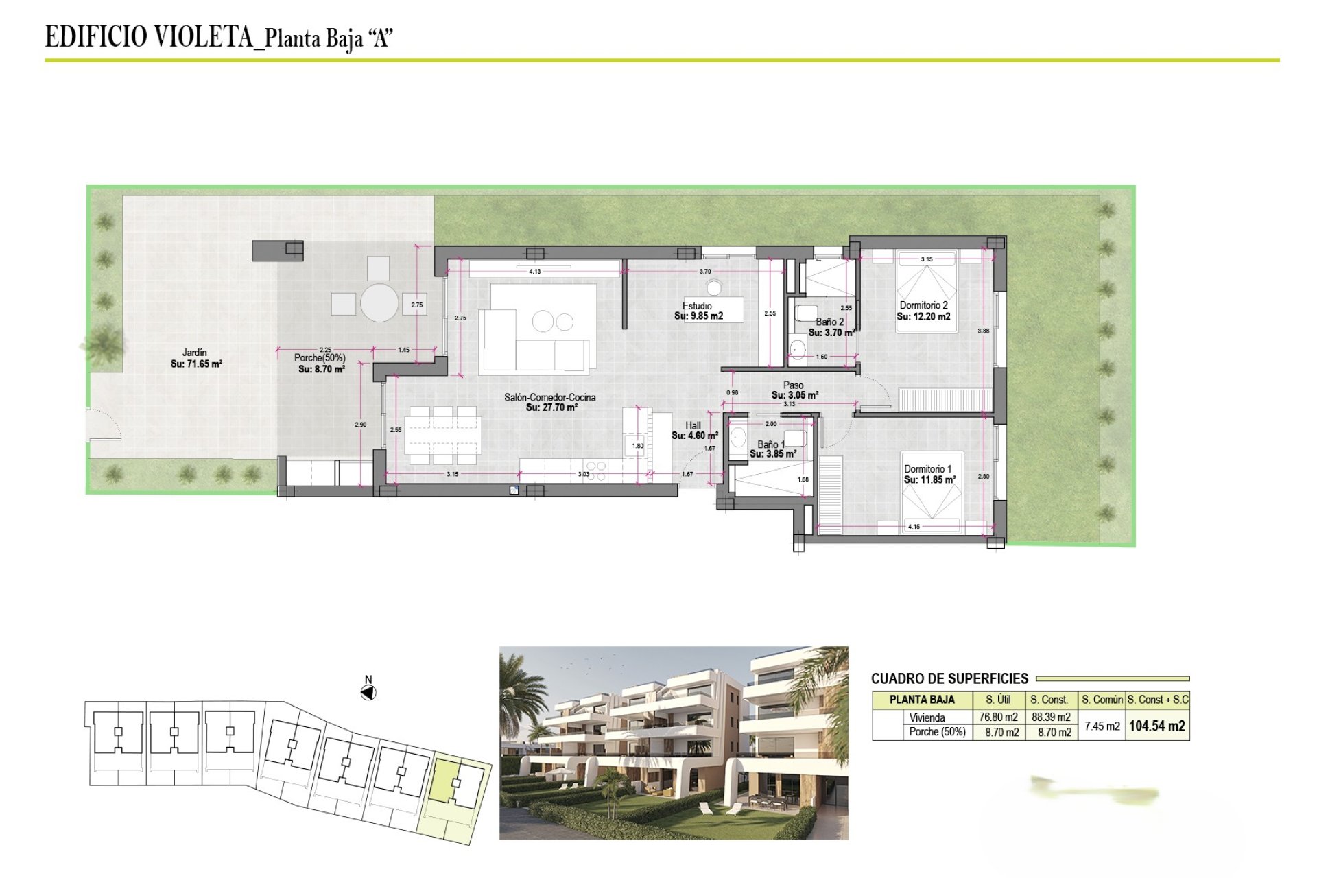Alicante Spain Properties presents an exclusive residential complex in Los Guardianes, consisting of 14 homes that include apartments, ground floors, bungalows with gardens, and penthouses. Ideal for those seeking modern comfort and functionality, these properties offer top-quality appliances, built-in wardrobes, and pre-installation of air conditioning. Just 41.3 km from the airport, the location combines tranquility with accessibility to services. With options of 2 or 3 bedrooms and 2 bathrooms, each home is designed to meet various family needs.